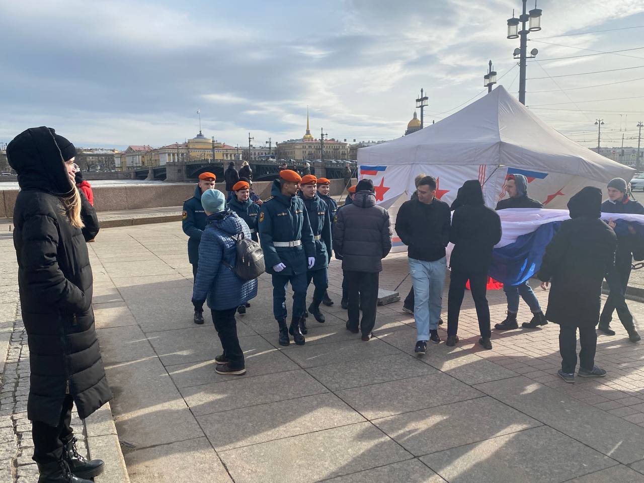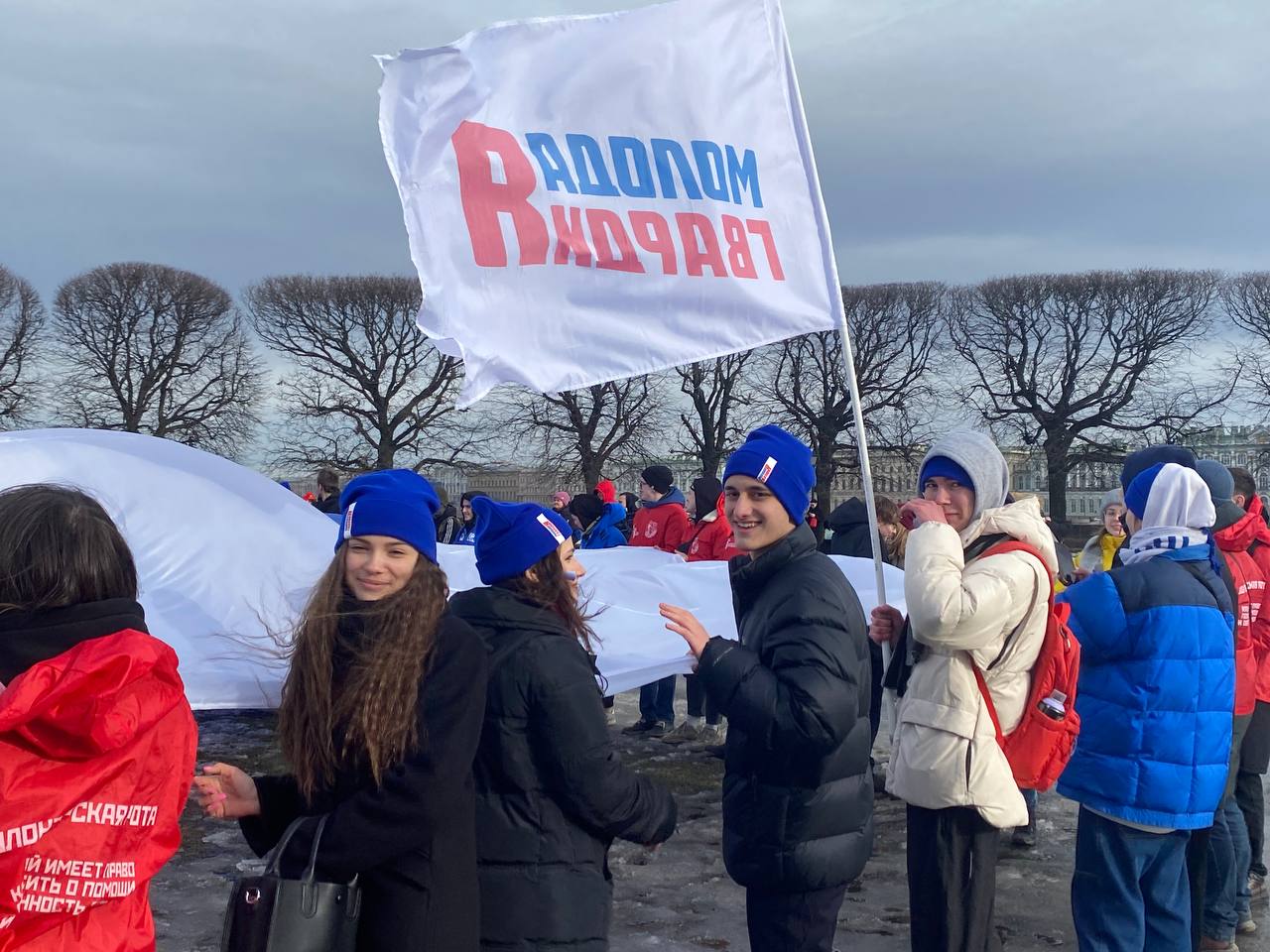 На мероприятие привезли волонтеров, юнармейцев, школьников и студентов. Sota пишет, что студентам СПбГУ за участие обещали освобождение от пар.