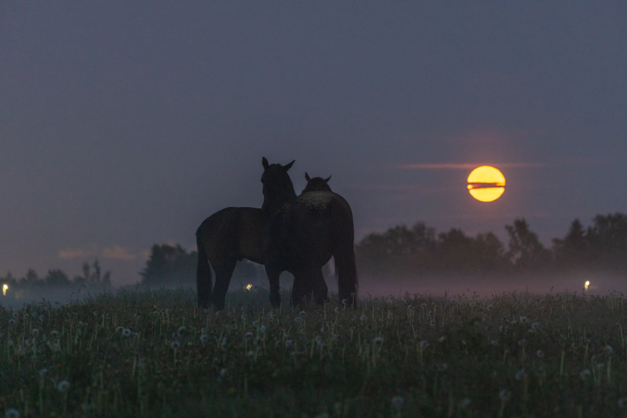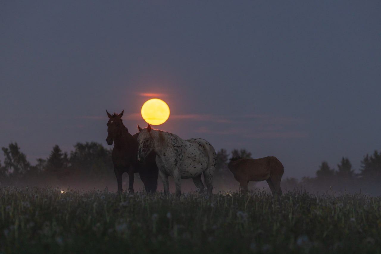 «Клубничное полнолуние», серебристые облака и лошади в тумане. Какой была ночь под Петербургом: фото и видео