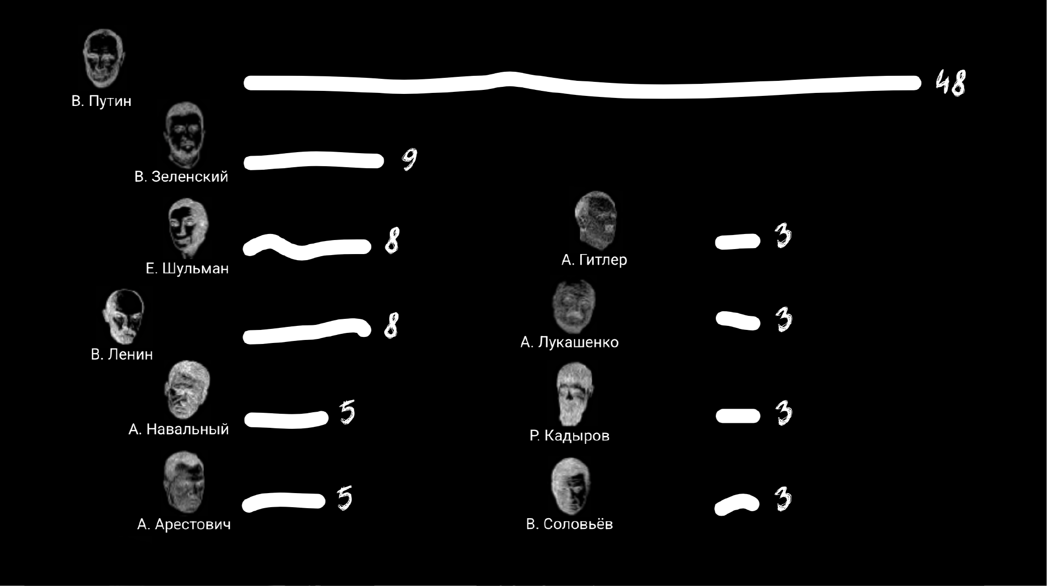 Кроме него, снятся люди, о которых много говорят в СМИ или от которых сейчас что-то зависит (Зеленский, Лукашенко, Кадыров), лидеры мнений (Шульман, Арестович, Навальный, Соловьев) и фигуры прошлого (Ленин, Гитлер).