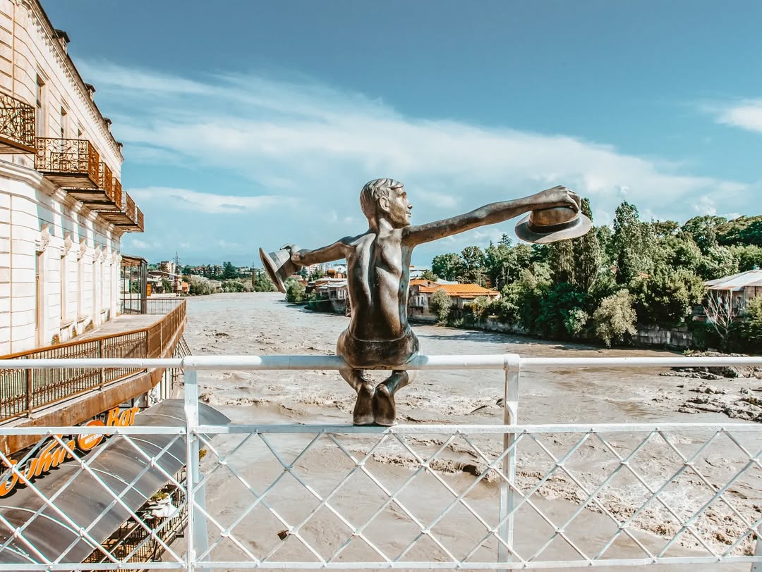 Another symbol of the city is the White Bridge, featuring a statue of a boy with two hats—a reference to the 1968 Georgian film An Unusual Exhibition, directed by Eldar Shengelaia. directed by Eldar Shengelaia and based on a script by Rezo Gabriadze. The screenplay was written by Rezo Gabriadze, who later created the classics Mimino, Don’t Grieve, and Kin-dza-dza!. An Unusual Exhibition was shot in Kutaisi and Batumi. If you watch it, you’ll discover the meaning behind the boy’s two hats.