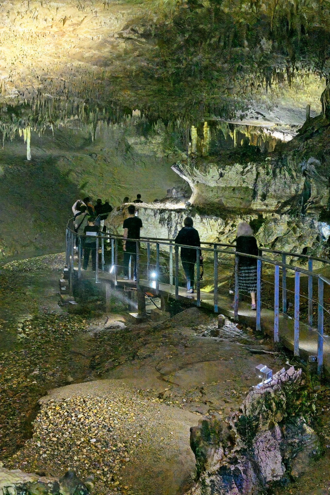 A small underground river flows through the cave, leading to a lake where visitors can take a boat ride for an unforgettable experience.
