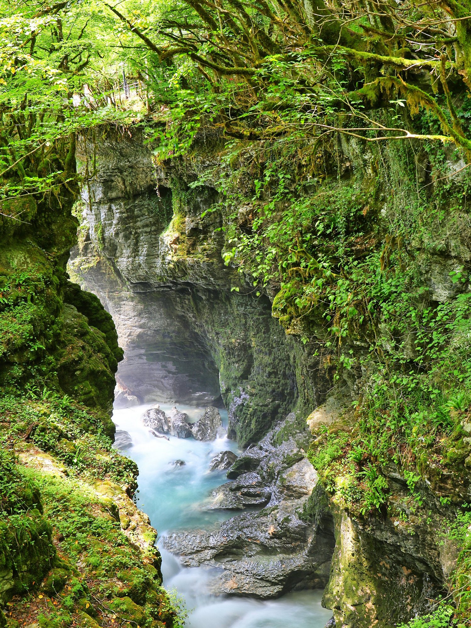 Located 50 km west of Kutaisi, Martvili Canyon was formed by the Abasha River. It stretches for 2.4 km, with depths ranging from 50 to 70 meters. In the upper part of the canyon, visitors can take a boat ride, while the lower section features numerous waterfalls and a well-maintained walking trail with scenic viewpoints. Thanks to its lush evergreen vegetation, the canyon looks like summer all year round. The crystal-clear water exhibits vibrant emerald and blue hues. Bring warm clothes, as the canyon tends to be chilly.