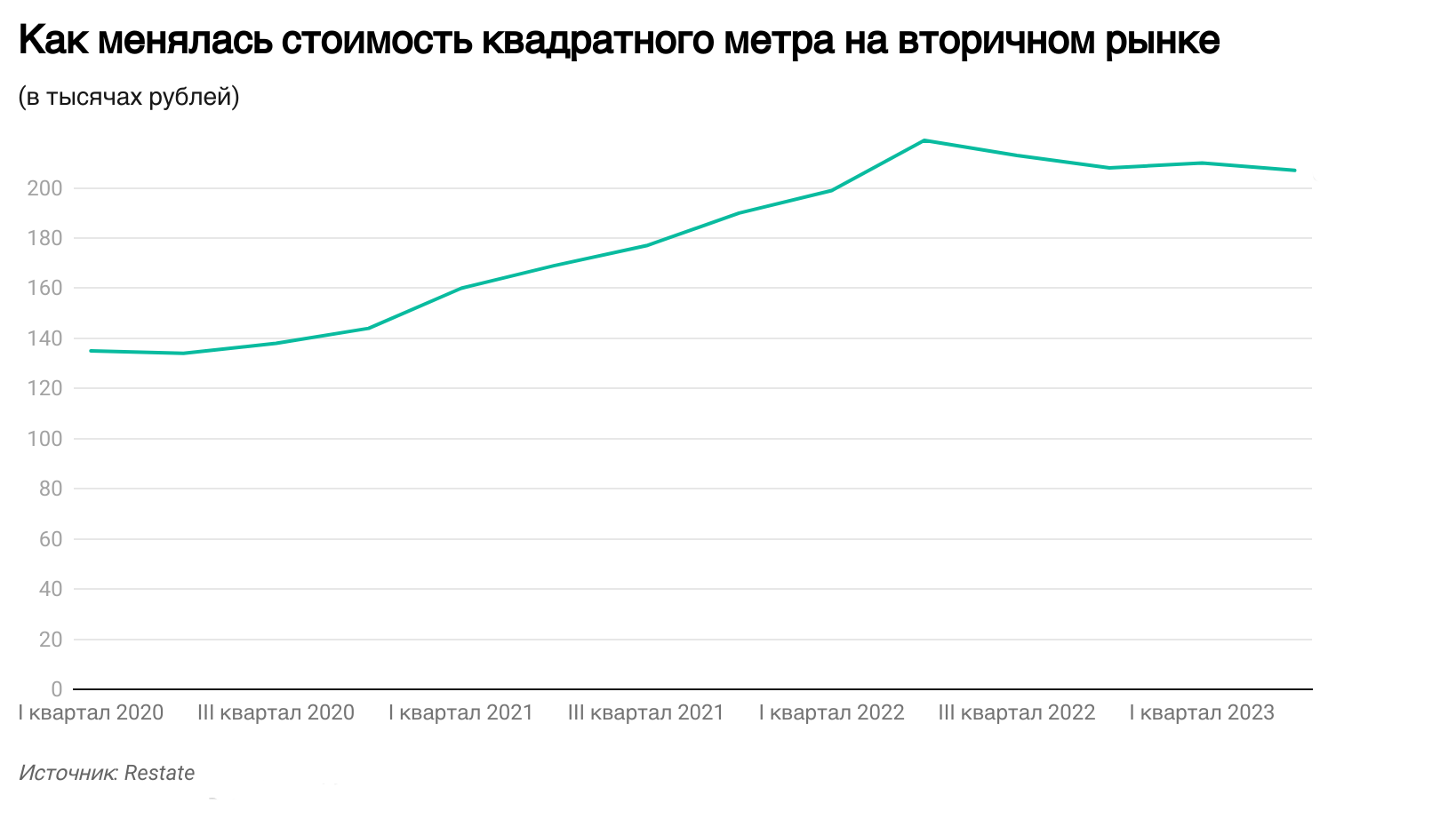 Незначительное снижение стоимости квартир на вторичном рынке фиксирует и сервис Restate: по данным этого портала, в начале мая 2023 года средняя цена квадратного метра в городе составляла 209,3 тысячи рублей. В начале 2023-го этот показатель составлял 209,6 тысячи, а в течение 2022 года достигал 219 тысяч рублей.