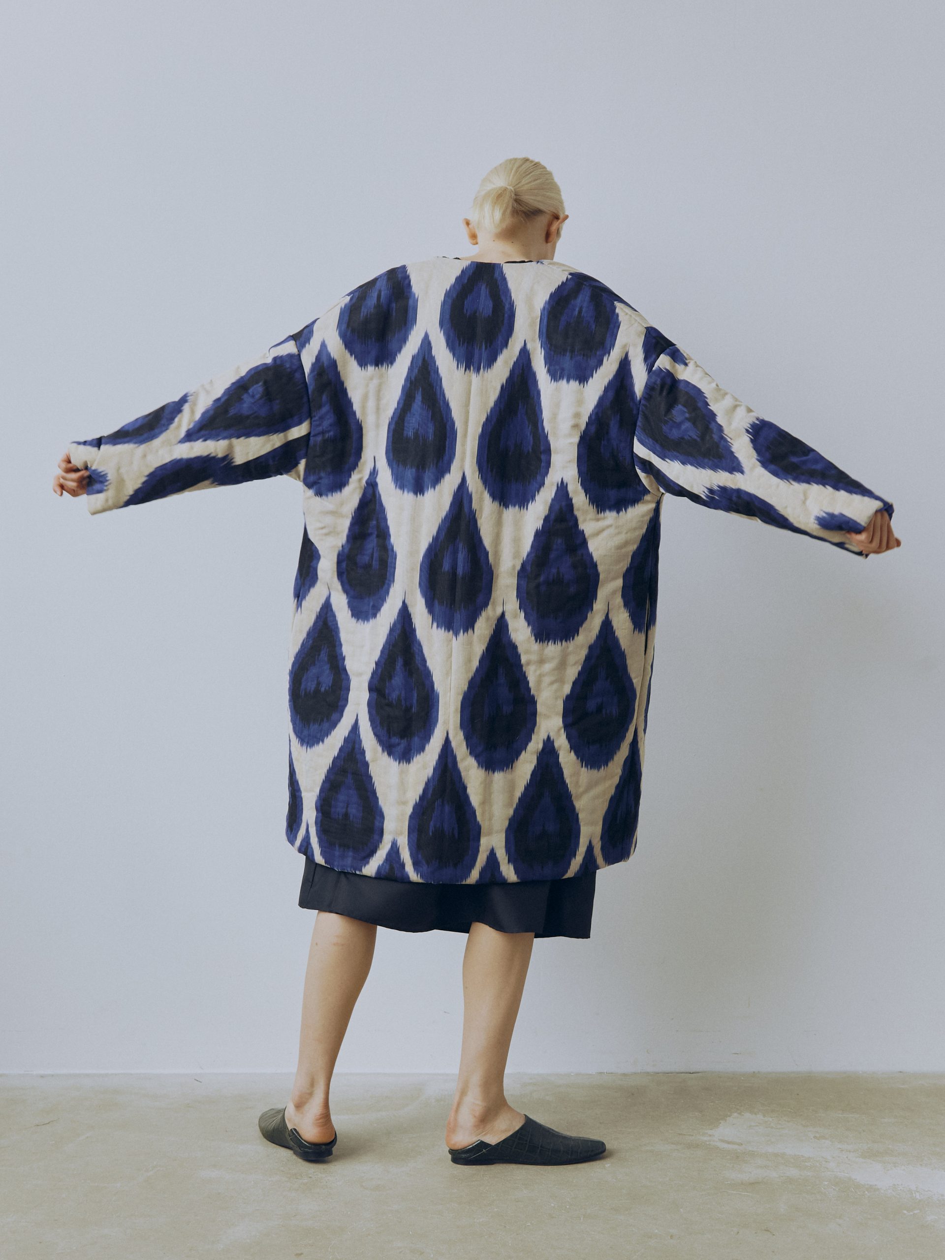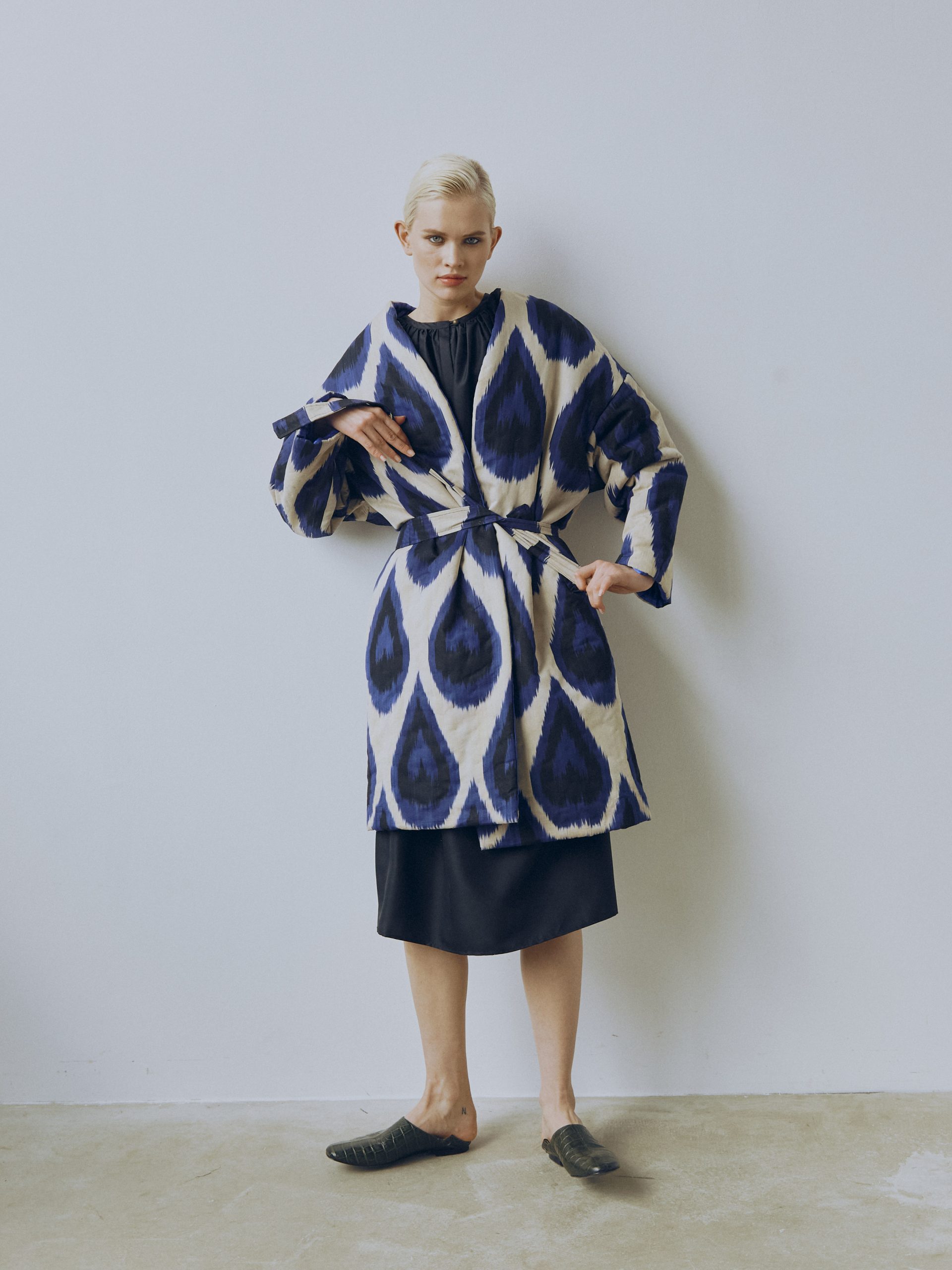 Один из вариантов летнего пальто — пальто-чапан из узбекской ткани икат. Его можно носить с чем угодно, от джинсов до сдержанных вечерних платьев: яркость узора и простой крой делают его по-настоящему универсальным. Носить можно с поясом или без. Atlas Mira, 21 750 рублей. Фото бренда