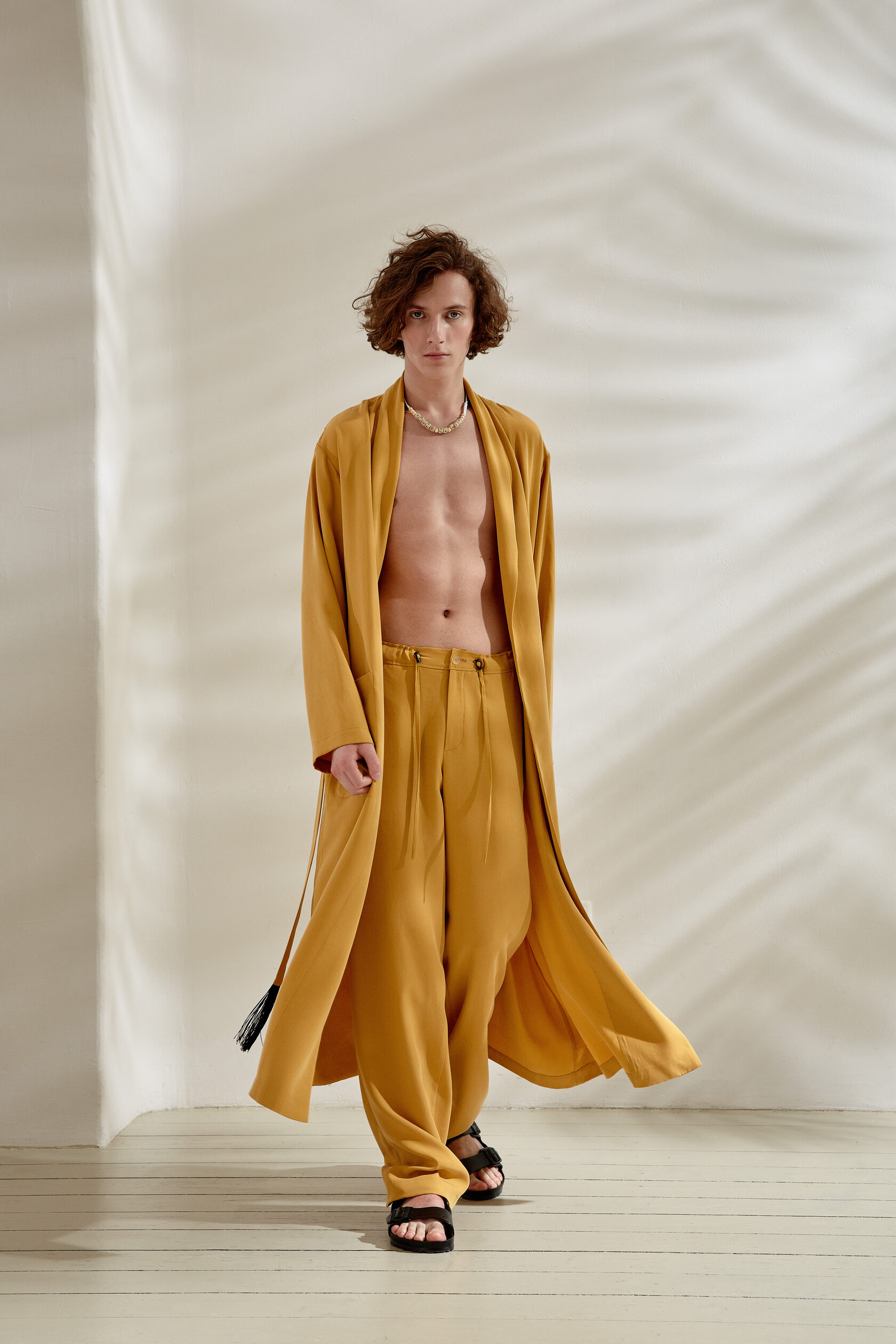 На сайте бренда этот предмет ласково назвали халатом, но тех, кто видел его на показе (и трогал его после), не проведешь: красивый желтый тенсел здесь явно не для того, чтобы прятать его в спальне или бане. Этот экземпляр вполне можно рассматривать как семейную гардеробную инвестицию и носить по очереди. House of Leo, 21 000 рублей. Фото бренда