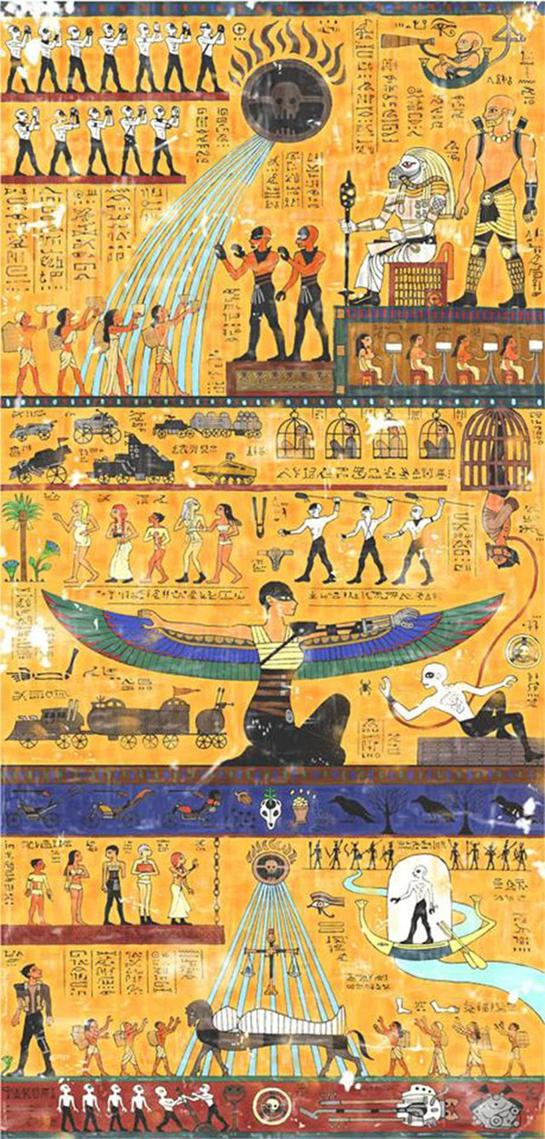 Японский художник Такуми передал основные вехи сюжета «Безумного Макса: Дорога ярости» в рисунке, стилизованном под египетский папирус.