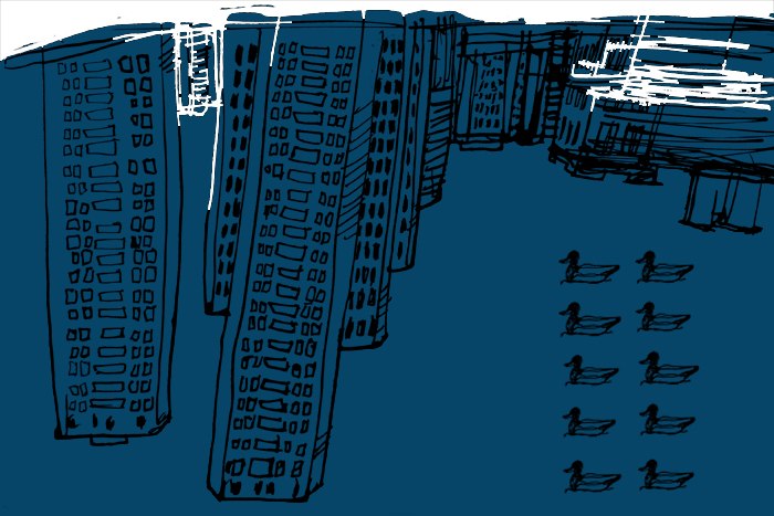 Новые высотные голубые дома на Поклонной горе, которые встают над первым озером и отражаются в нем, напоминая Манхэттен