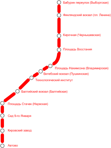 «Автово», «Кировский завод», «Сад 9 января», «Площадь Стачек», «Балтийский вокзал», «Технологический институт», «Витебский вокзал», «Площадь Нахимсона», «Площадь Восстания», «Кирочная», «Финляндский вокзал» и «Бабурин переулок» (единственная станция мелкого заложения). Но уже в техническом проекте было оставлено только десять: от «Сада 9 января» и «Площади Нахимсона» отказались. Война, однако, помешала выполнить и эти планы: работы по прокладке тоннелей остановились, не успев начаться.