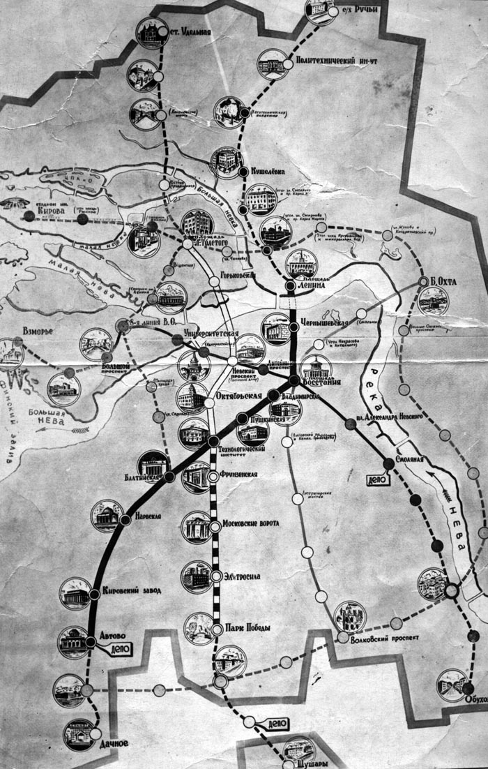 На рубеже 50-х и 60-х годов в Ленинграде была выпущена печатная фантазия на тему того, как будет выглядеть метро в 1980 году. Всерьез строить его в таком виде никто не собирался с самого начала — еще в 1957 году первую линию собирались вести на Петроградскую сторону. Но на протяжении нескольких следующих десятилетий элементы этого плана всплывали в схемах развития подземки. И неудивительно: уже в те годы на ней существовали и планы продления Московско-Петроградской линии на север до «Удельной», а на юг — до «Шушар».