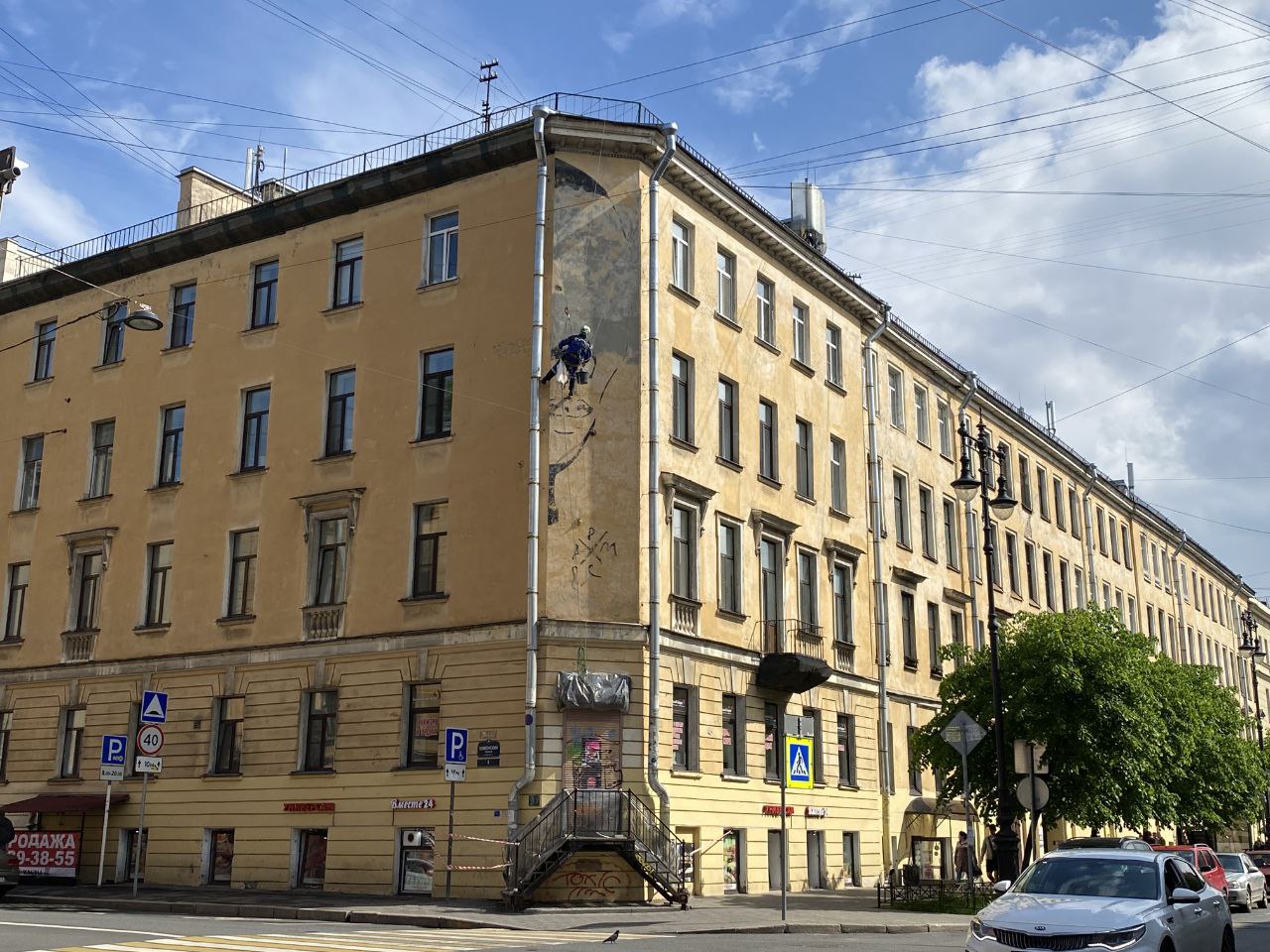 Утром 4 июня коммунальщики начали закрашивать мурал с Даниилом Хармсом на улице Маяковского. К вечеру от портрета ничего не осталось — всю стену дома № 11 покрыли краской серого цвета. Теперь там появится световая проекция.