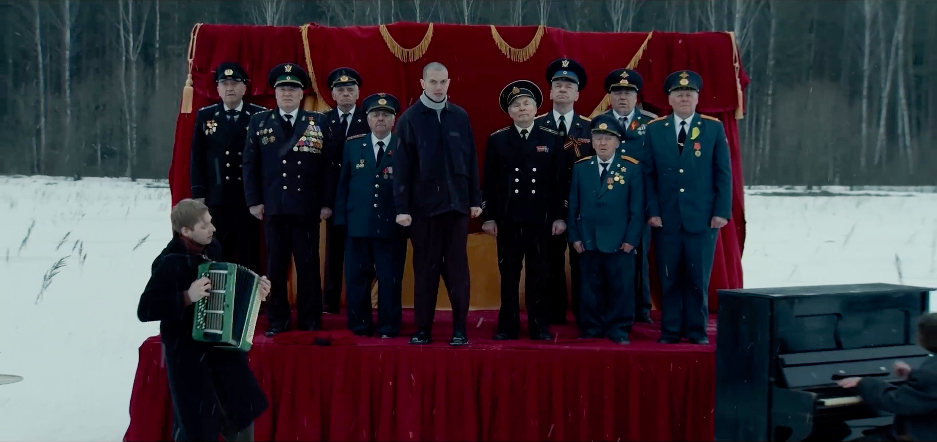 Хор ветеранов в форме и с орденами на небольшой сцене посреди заснеженного поля. Музыкант Николай Комягин солирует. «Над собором Кремля поднимается пепел». Перед сценой участники группы выкапывают могилу, ветераны кидают в нее яблоки.
