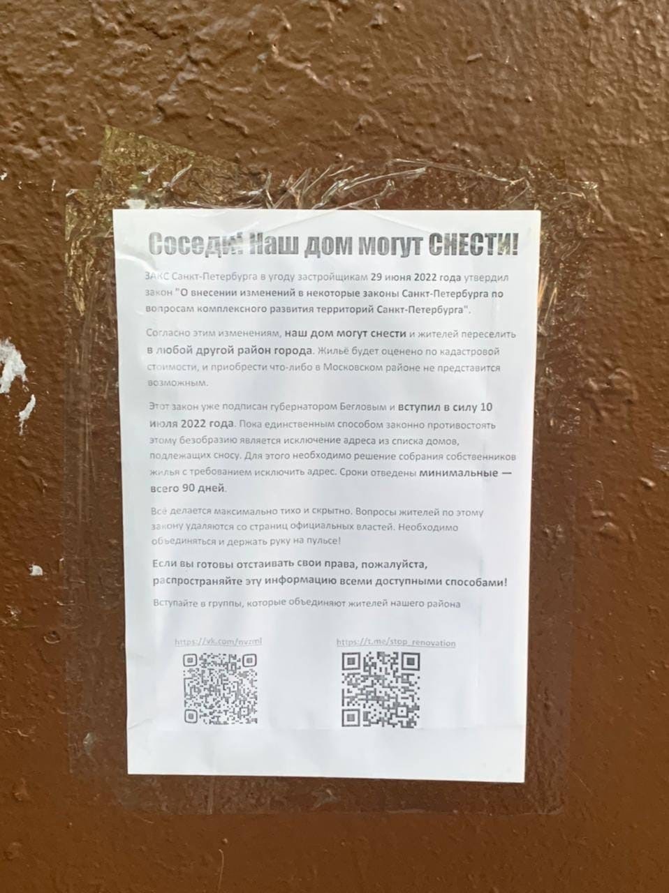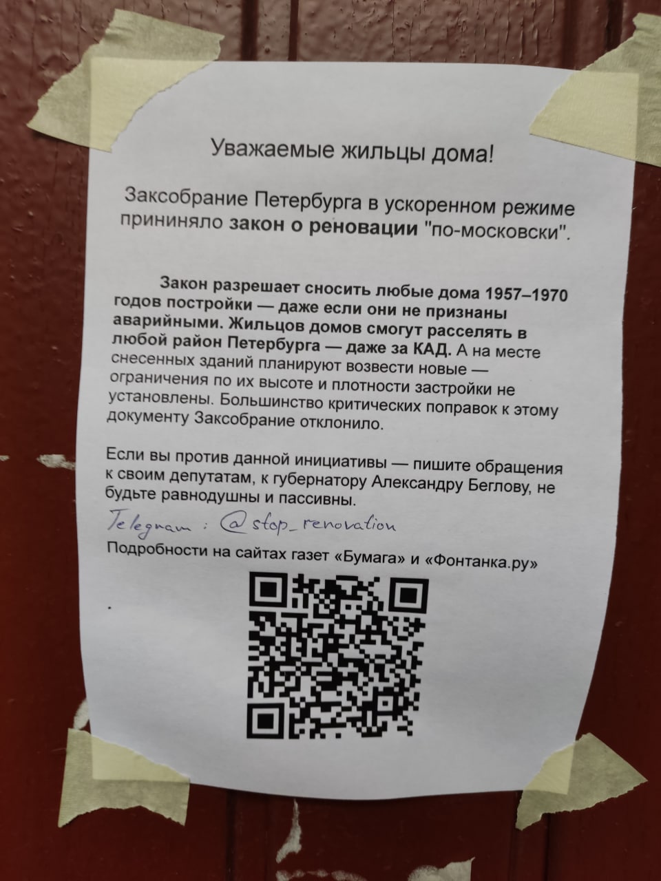 На домах, которые могут снести, клеят листовки про закон о реновации. На листовках есть QR-код, ведущий в телеграм-чат «КРТ (Реновация) СПБ», где собрались уже более 6 тысяч человек. Участники чата объединяются в группы по улицам и домам, обсуждают, где и как лучше клеить объявления, которые иногда срывают, публикуют ответы на обращения от Беглова и видео собраний жильцов, пишут про полицию, которая приходит на сборы подписей и разгоняет жителей, а иногда помогает.