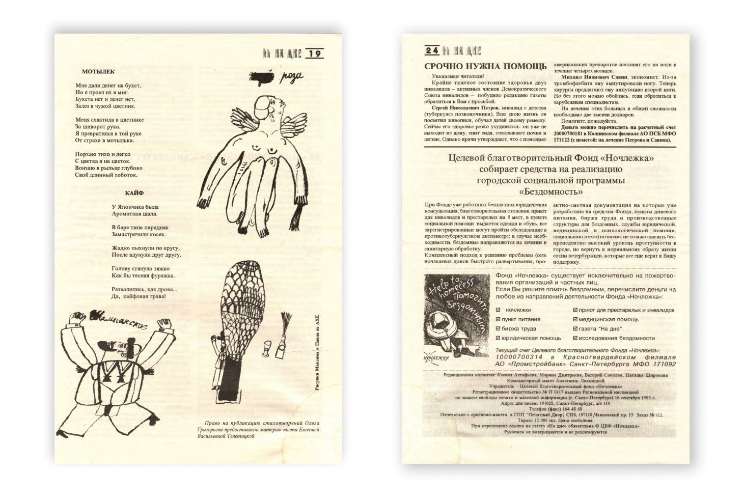 Газета «На дне» — это петербургский бренд из 90-х. Ее продавали на улицах бездомные горожане, зарабатывая себе на еду. В газете были истории самих бездомных, культурное приложение «Над не», в ней публиковали тексты представителей новой Академии изящных искусств Тимура Новикова. А редактором был Валерий Соколов, основатель «Ночлежки».