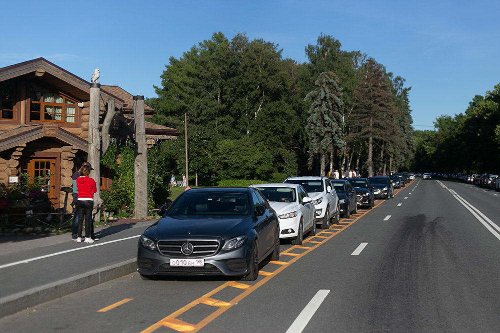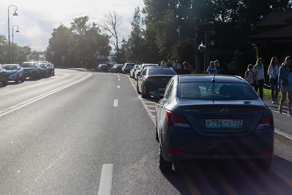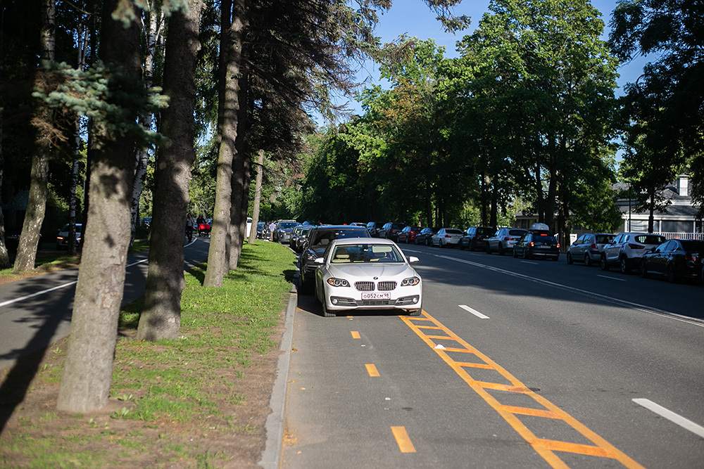 Велодорожку на Крестовском острове заставили автомобилями через три дня после открытия. Десятки машин стоят на полосе, идущей по Южной дороге.