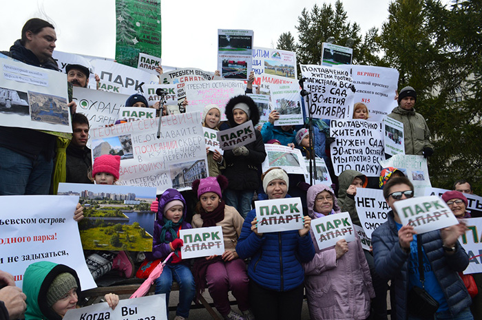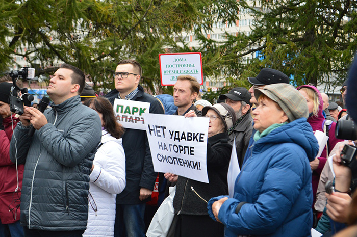 30 сентября в Петербурге прошел митинг за создание парка в устье реки Смоленки. Участники акции стояли с плакатами «Парку на Смоленке — да, стройке — нет» и «Апарты вне закона». По данным организаторов, на акцию пришло около тысячи местных жителей.