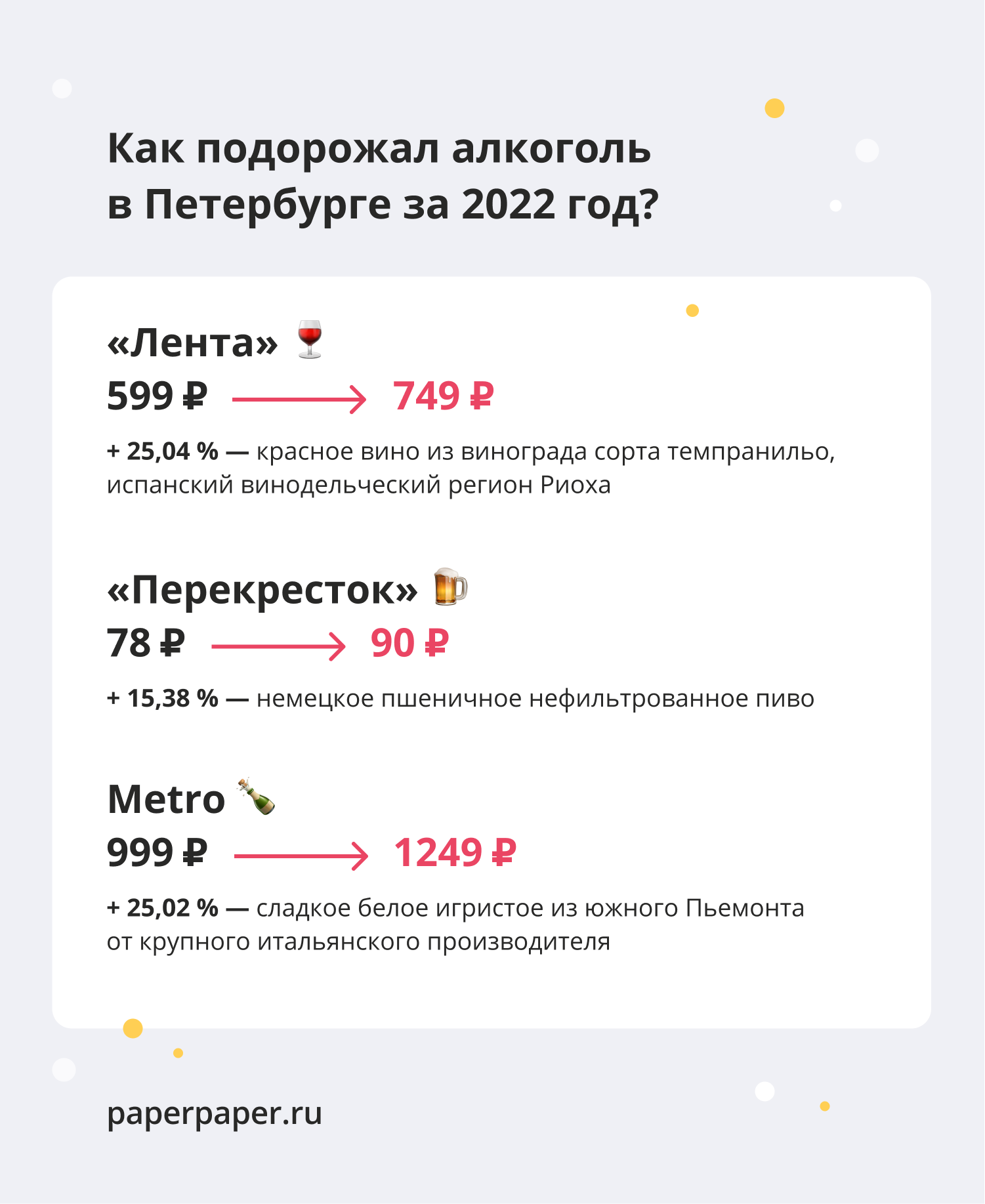 Схожая тенденция заметна и по другим источникам — например, по сайту Vinofan, где публикуются обзоры скидок на вина в российском ретейле. Из публикаций на этом портале следует, что в «Пятерочке» акционная цена кьянти от одного из итальянских кооперативов за год выросла с 399 до 503 рублей (+ 26,6 %). Один из видов кавы в той же сети подорожал на 14,05 %: с 569 до 649 рублей.
