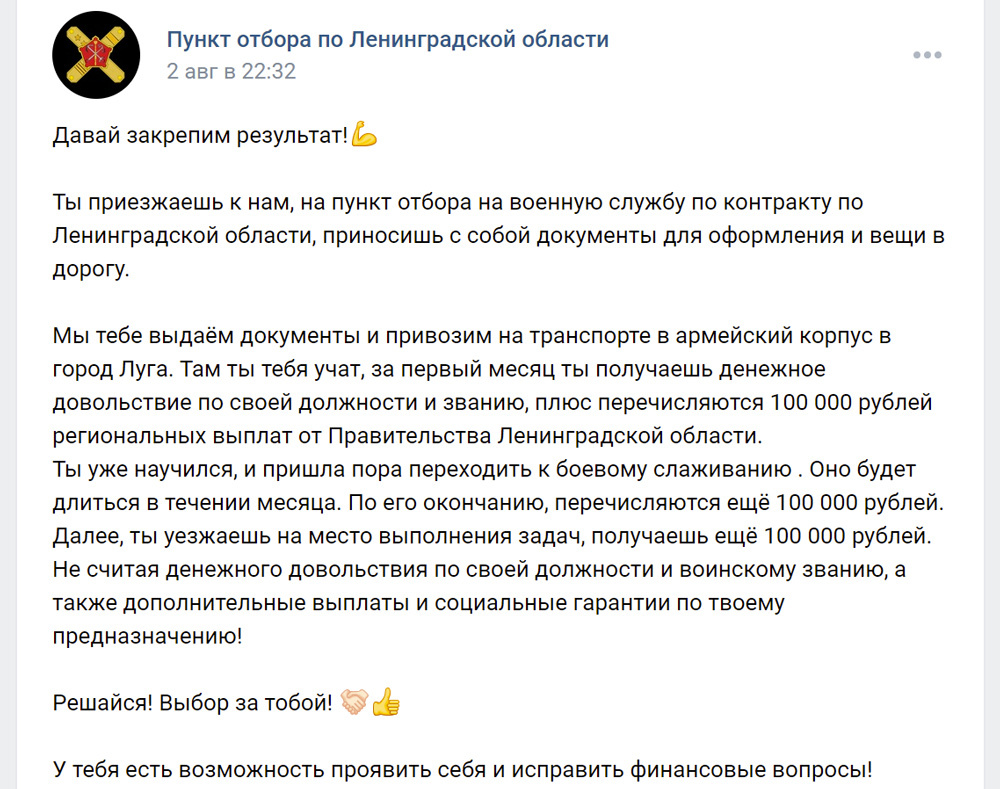 В Петербурге и Ленобласти желающим вступить в именные подразделения также необходимо связаться с военкоматом и подписать контракт, убедилась «Бумага». Ранее в Петербурге уже проходила активная кампания с призывом подписывать военные контракты, причем на схожих условиях (об этом — в главах ниже).