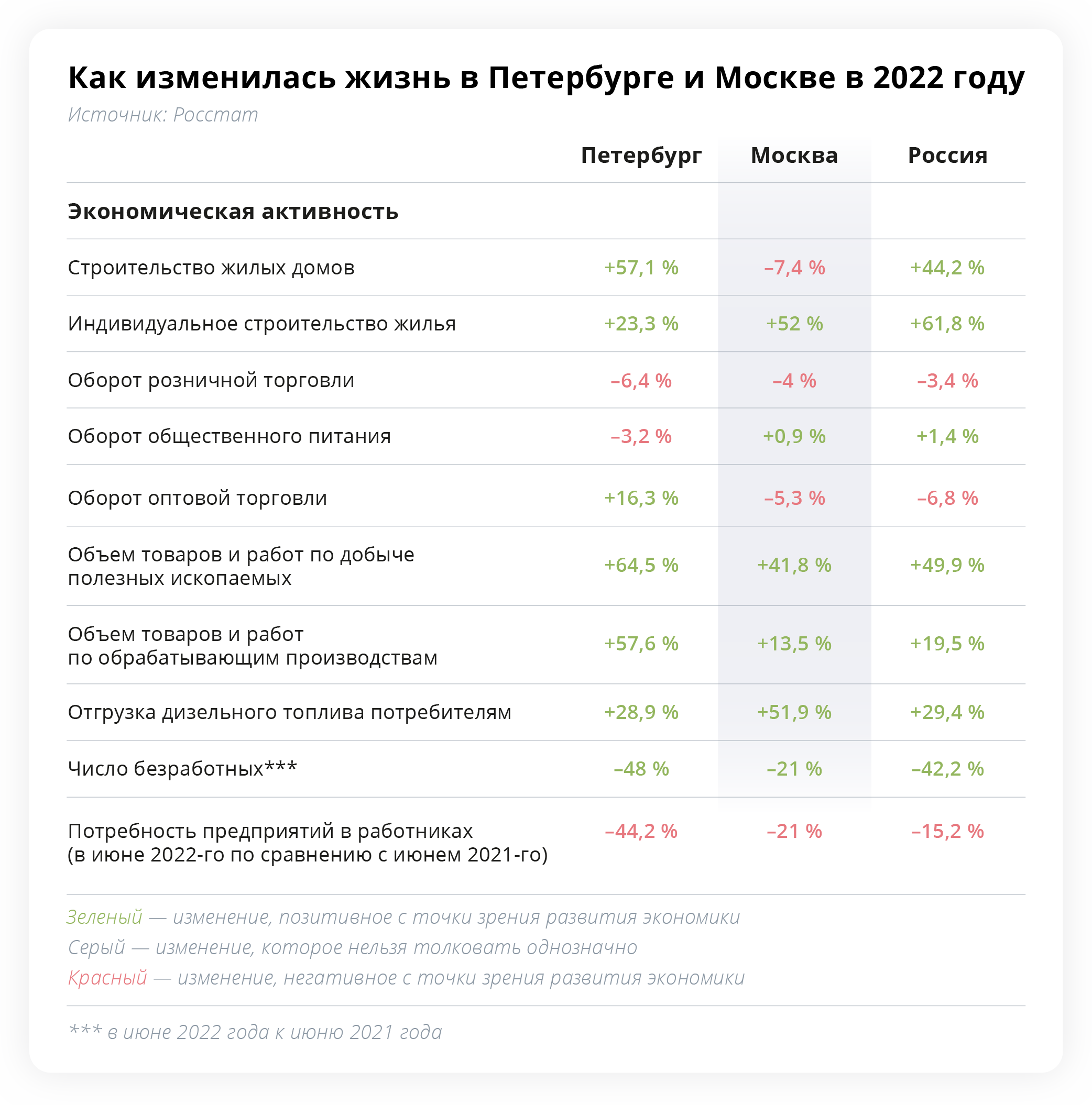 Другая ситуация — в строительной отрасли. В Петербурге за первое полугодие 2022 года построили на 57,1 % больше квадратных метров жилья, чем за тот же период 2021-го. При этом в Москве объемы жилого строительства, напротив, снизились.