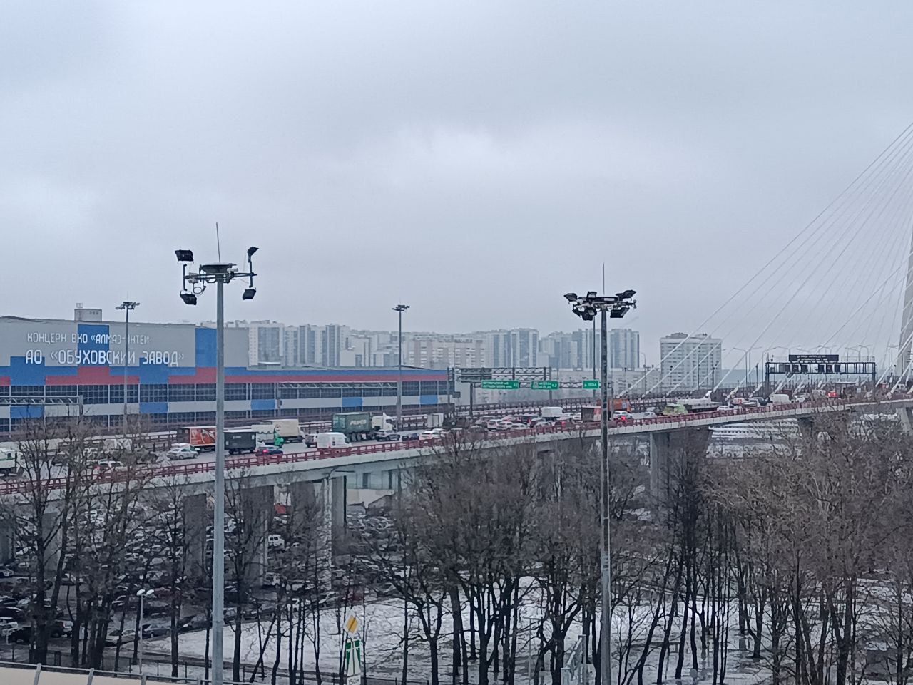 После этого Путин поехал на встречу с рабочими концерна «Алмаз-Антей» на Обуховском заводе. Читатели «Бумаги» рассказывают, что КАД около Обуховского завода в сторону Московского шоссе перекрыли. Также закрыли проспект Обуховской обороны со стороны завода.