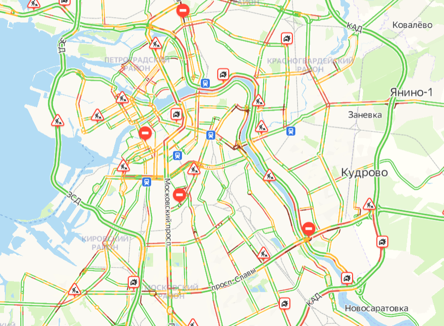 Тем временем пробки в Петербурге достигли значения в шесть баллов. Более серьезные заторы образовались в Центральном, Адмиралтейском, Петроградском, Невском и Калининском районах.