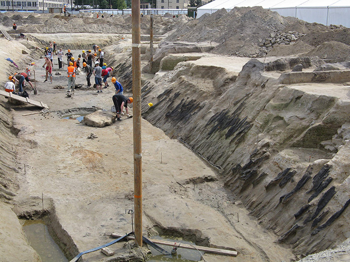 Раскопки на Охте начались в 1992 году, когда эта территория еще не считалась археологической. Тогда мы (Институт истории материальной культуры РАН — прим. «Бумаги») планировали найти остатки памятников, которые упоминаются в исторических документах — крепости Ниеншанц и Ландскрона. Мы провели там разведочные исследования и подготовили документы для постановки территории на охрану, так как [на ней могли находиться] объекты культурного наследия. В 2001 году утвердили два памятника — крепость Ниеншанц на мысу и центральную часть города Ниена на правом берегу Охты.