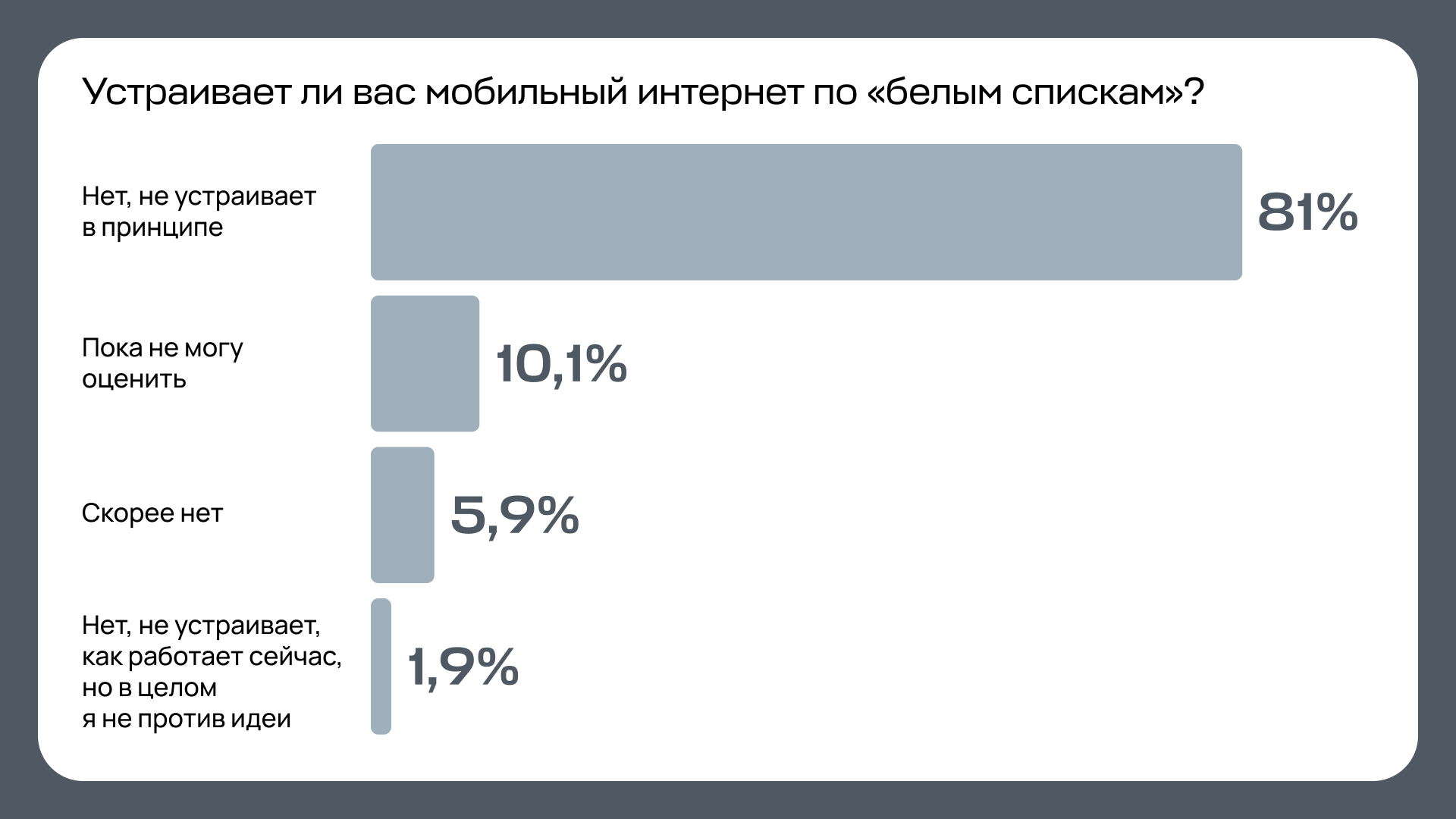 Из опрошенной аудитории «Бумаги» только 16 % сказали, что пользуются сервисами из «белых списков». 81 % заявили, что белые списки их «не устраивают в принципе», 10 % — что не могут их оценить. Некоторые опрошенные высказали опасение, что скоро к «белым спискам» может свестись весь интернет в России. Другие заметили, что сервисы из списка не всегда работают. «Бумага» рассказывала, почему такое возможно.