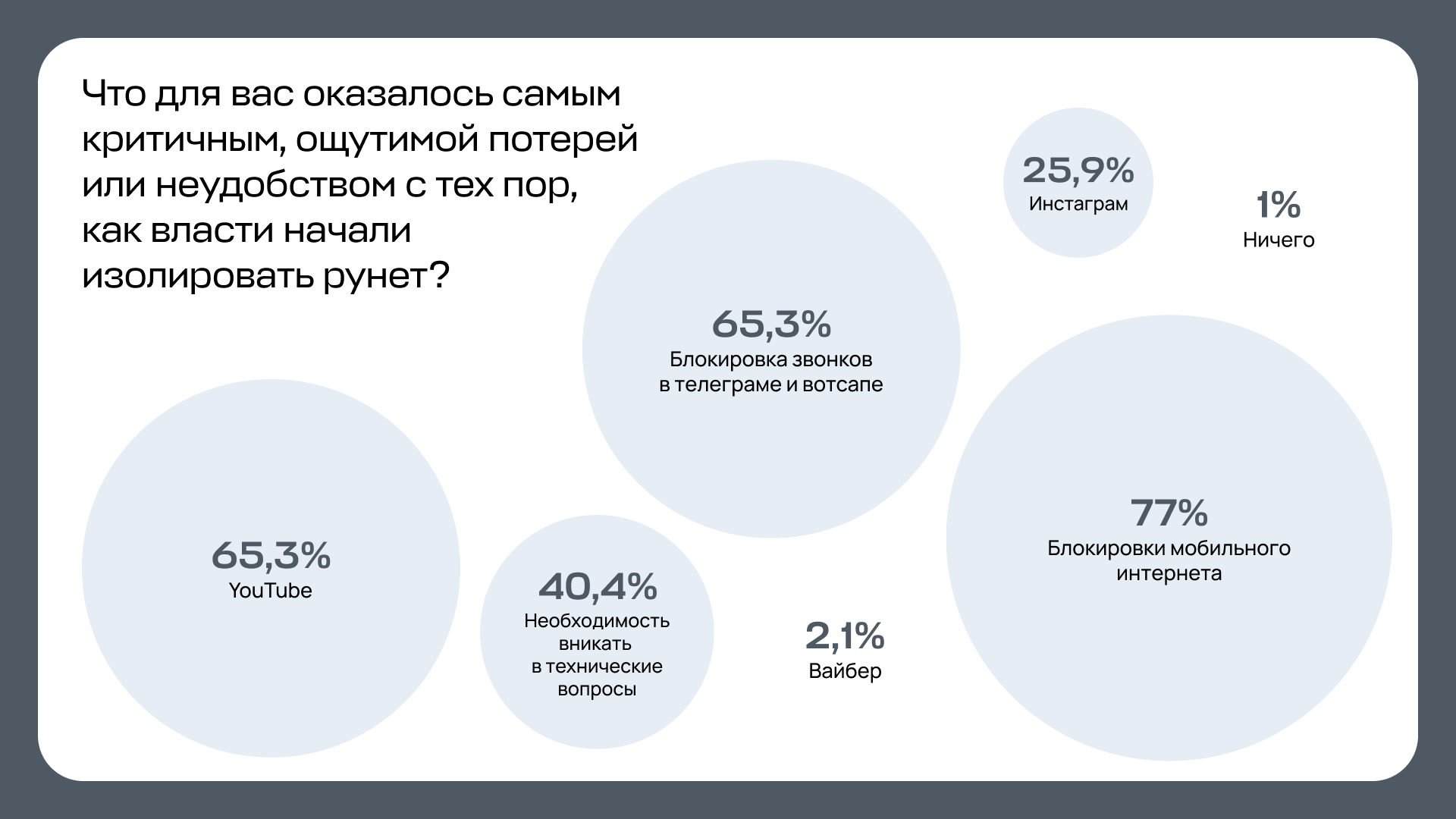 При этом 77 % опрошенных называет блокировки мобильного интернета самым большим неудобством с тех пор, как власти начали изолировать рунет. Второе место делят «замедление» ютьюба и блокировка звонков в вотсапе и телеграме — примерно по 65,3 %.