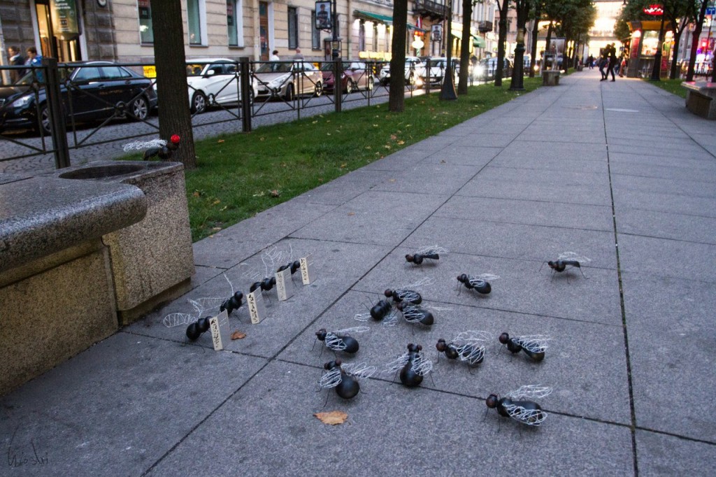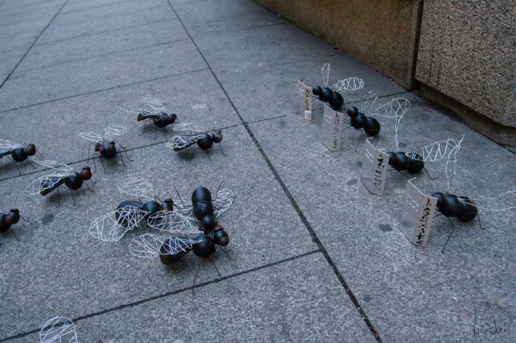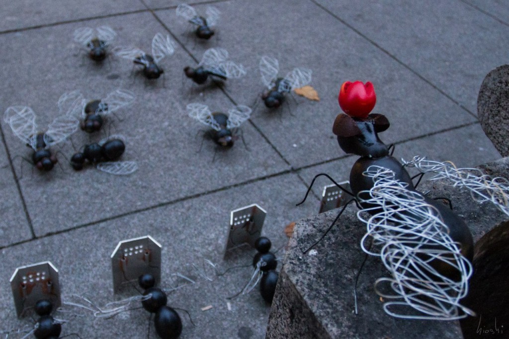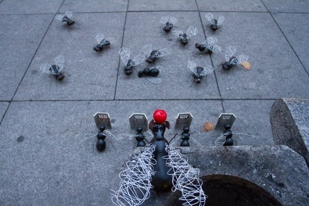 Анонимный уличный художник Hioshi разместил в Петербурге на Большой Конюшенной арт-объект о мухах, которые играют в людей. Об этом сам художник рассказал «Бумаге».