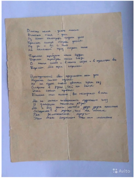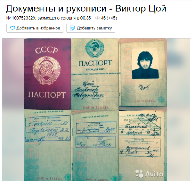 В среду объявление появилось на сайте «Авито». Как сообщили «Бумаге» в пресс-службе сервиса, оно провисело всего день: владелец документов — петербуржец по имени Дмитрий — передал их аукционному дому, «устав от звонков целый день». За вещи Цоя просили 3,5 млн рублей.