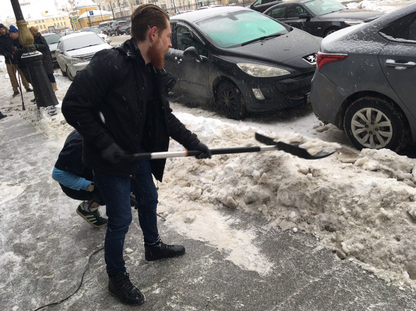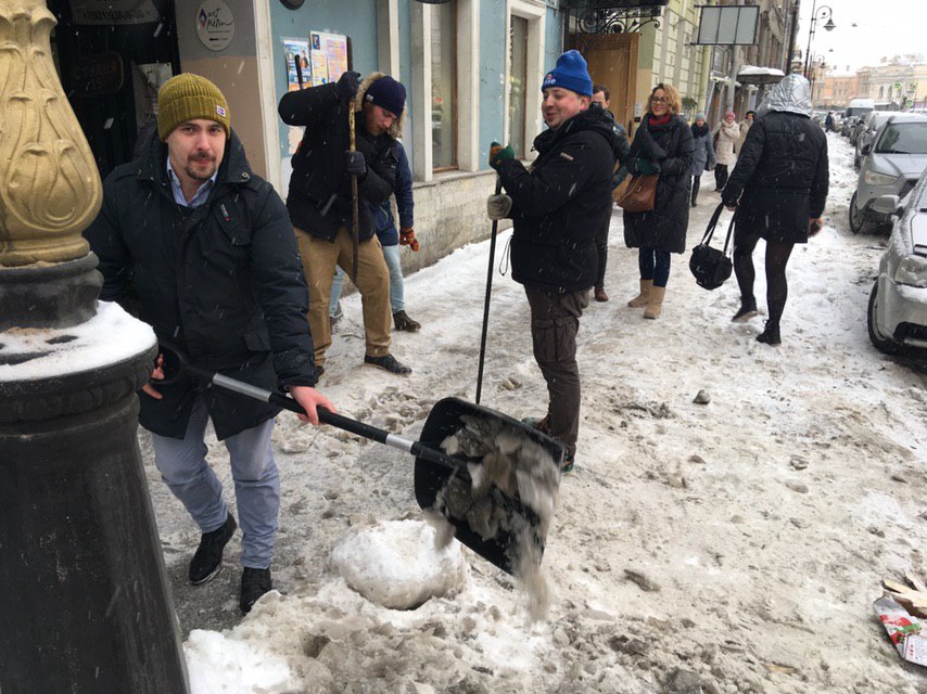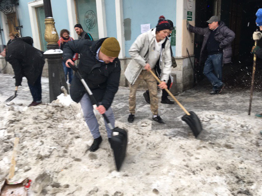 Работники шести петербургских баров на Белинского организовали акцию по уборке улицы. Они очищали ее с лопатами и перфораторами