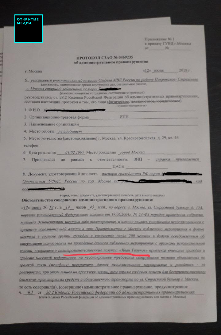 В протоколе сказано, что участница акции «выкрикивала антиправительственные лозунги: „Иван Голунов“, привлекая внимание граждан и средств массовой информации».