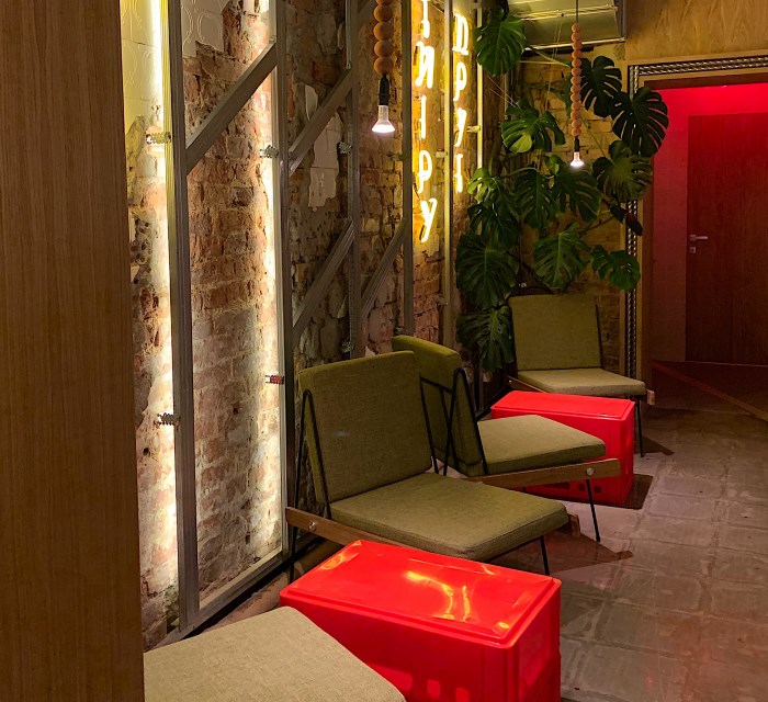 Помещение оформили дизайнеры из DА Bureau: они попытались совместить азиатский колорит с берлинским андеграундом. В центре зала расположена кухня, также в лапшичной можно найти столы разной высоты и чилл-зону с диванами. На стенах оставили советскую плитку, обнаруженную во время ремонта.