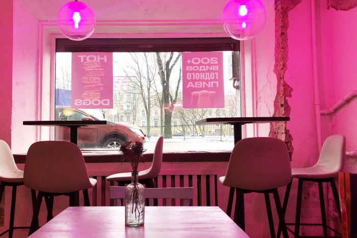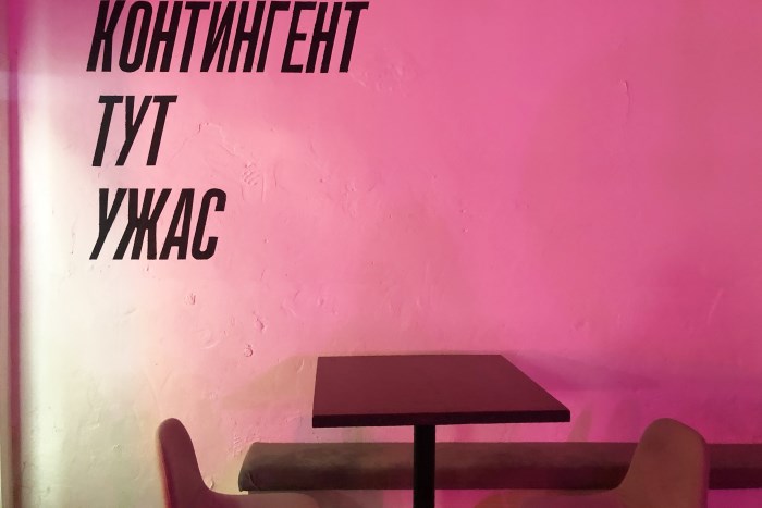 Оформлением помещения на 25 посадочных мест занималась Екатерина Башлыкова. Она придумала лофтовый дизайн с розовым потолком, неоновым светом и широким мягким подоконником. На одну из стен нанесли надпись «Контингент тут ужас».