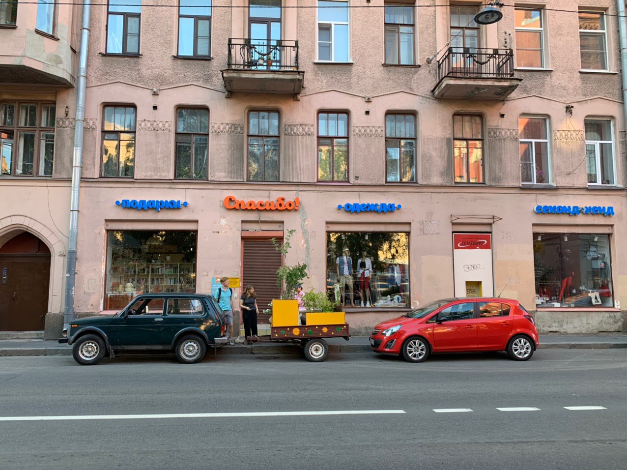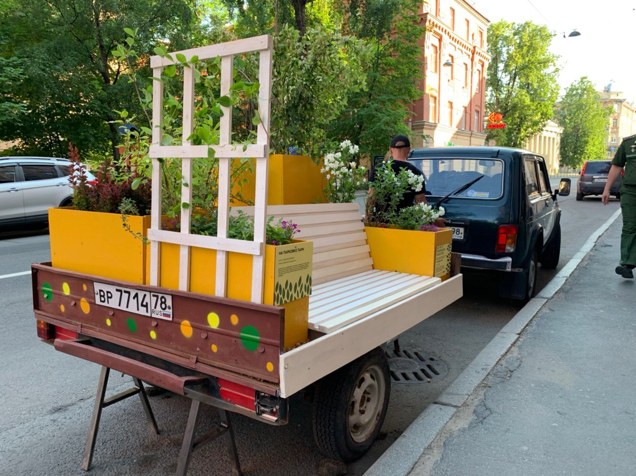 Петербургские активисты запустили проект «На парковке парк» — они обустроили зону отдыха с зеленью и скамейкой в прицепе и припарковали его на Чкаловском проспекте, 5.