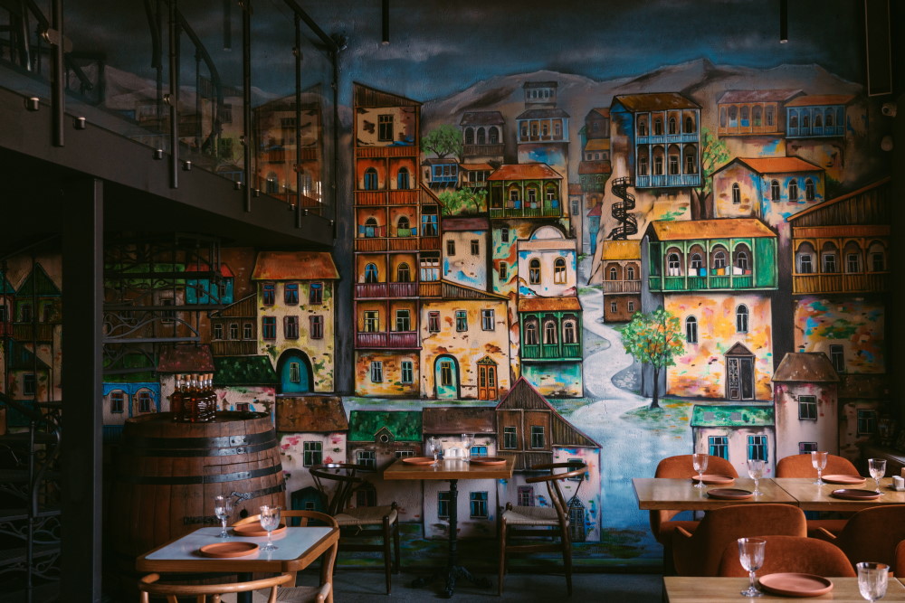 Стены расписали видами Тбилиси, на второй этаж ведет винтовая лестница. В этом же помещении работает и винотека с авторскими и натуральными грузинскими винами. Приобрести там можно, например, больше 100 янтарных вин из этой страны.