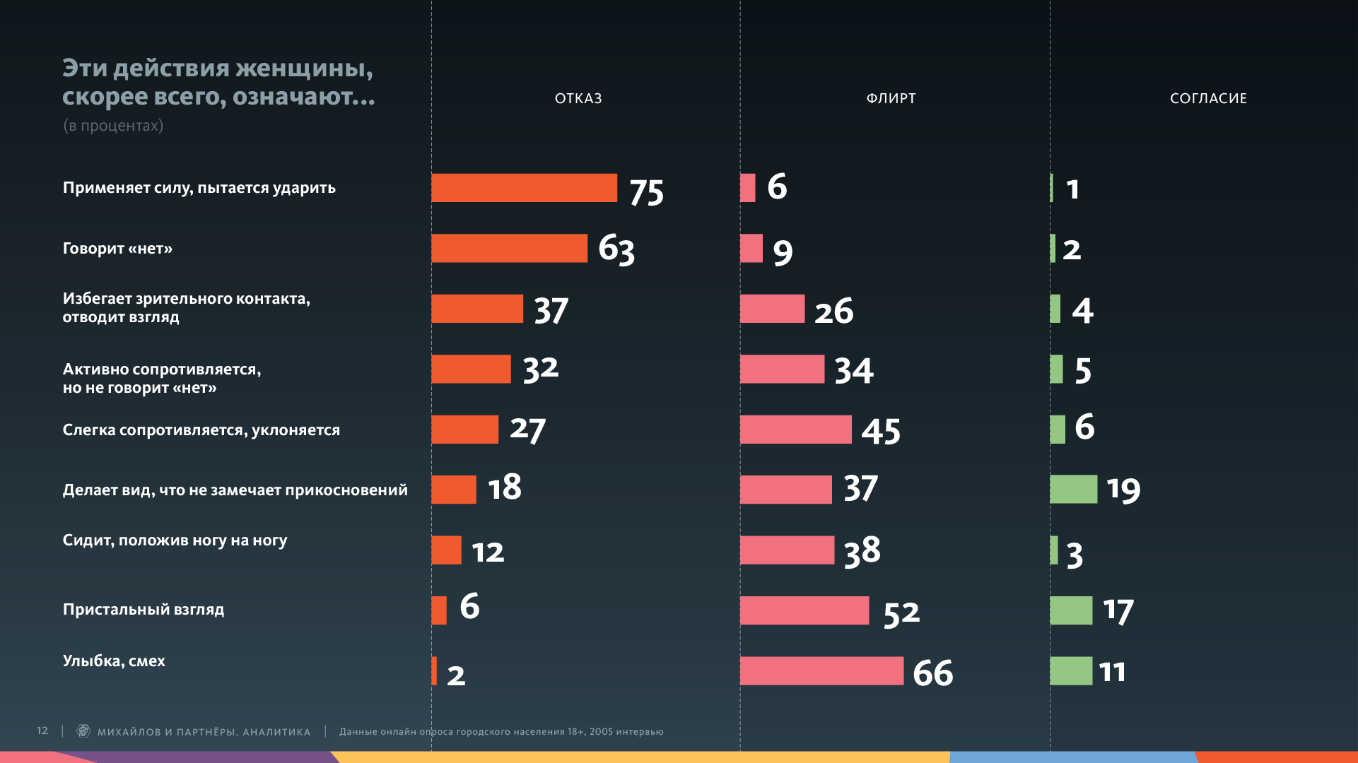 • Примерно 63 % «скорее всего» считают отказом, когда девушка говорит «нет». Еще 9 % могут счесть это флиртом, а 2 % — согласием. При этом если девушка активно сопротивляется, но не говорит «нет», то 32 % сочтут это отказом, 34 % — флиртом, а 5 % — согласием.