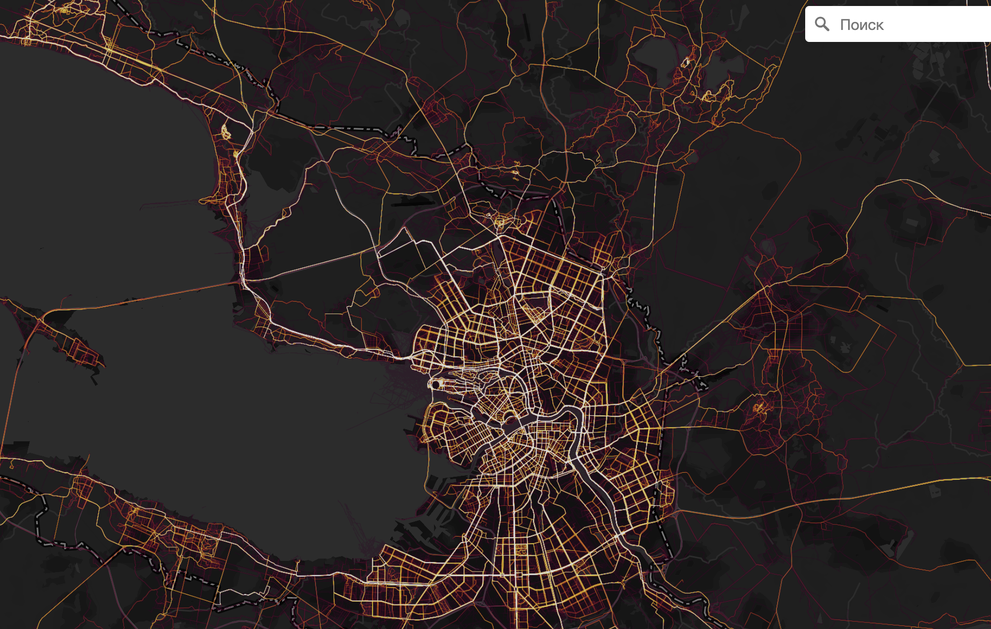 Скриншот из Strava Global Heatmap. Чем чаще велосипедисты используют ту или иную дорогу, тем светлее она отмечается на карте