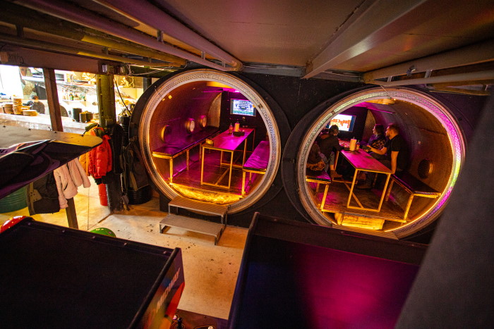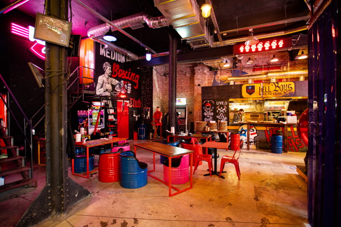 Новое заведение заняло двухэтажное помещение с игровыми автоматами и двумя кухнями. Залы оформили в стиле киберпанка и ретрофутуризма. Сейчас KRNG corporation работает в тестовом режиме, подробную информацию можно найти в инстаграме проекта.