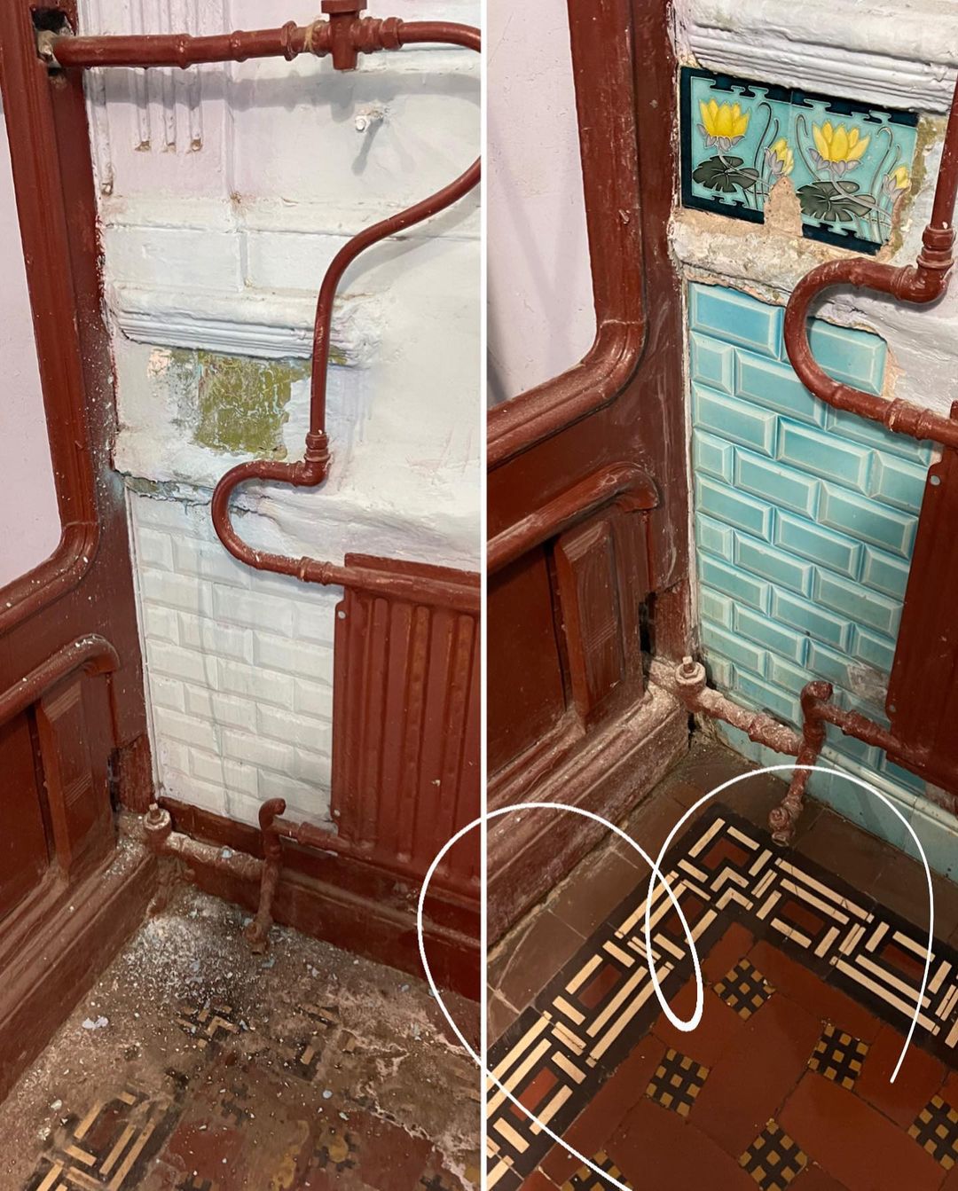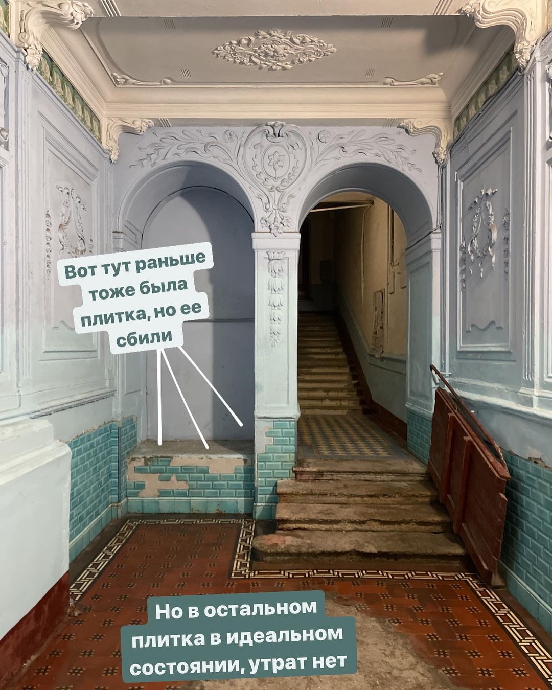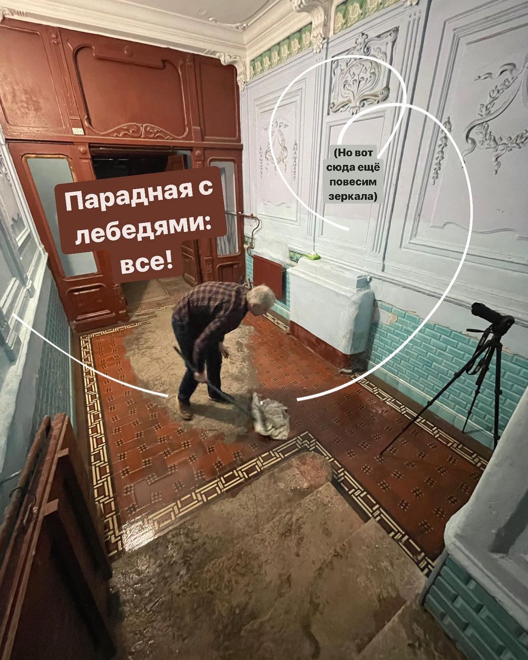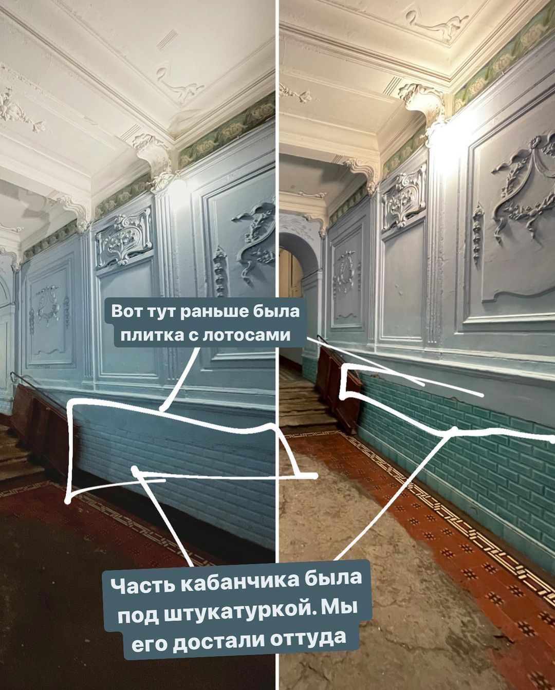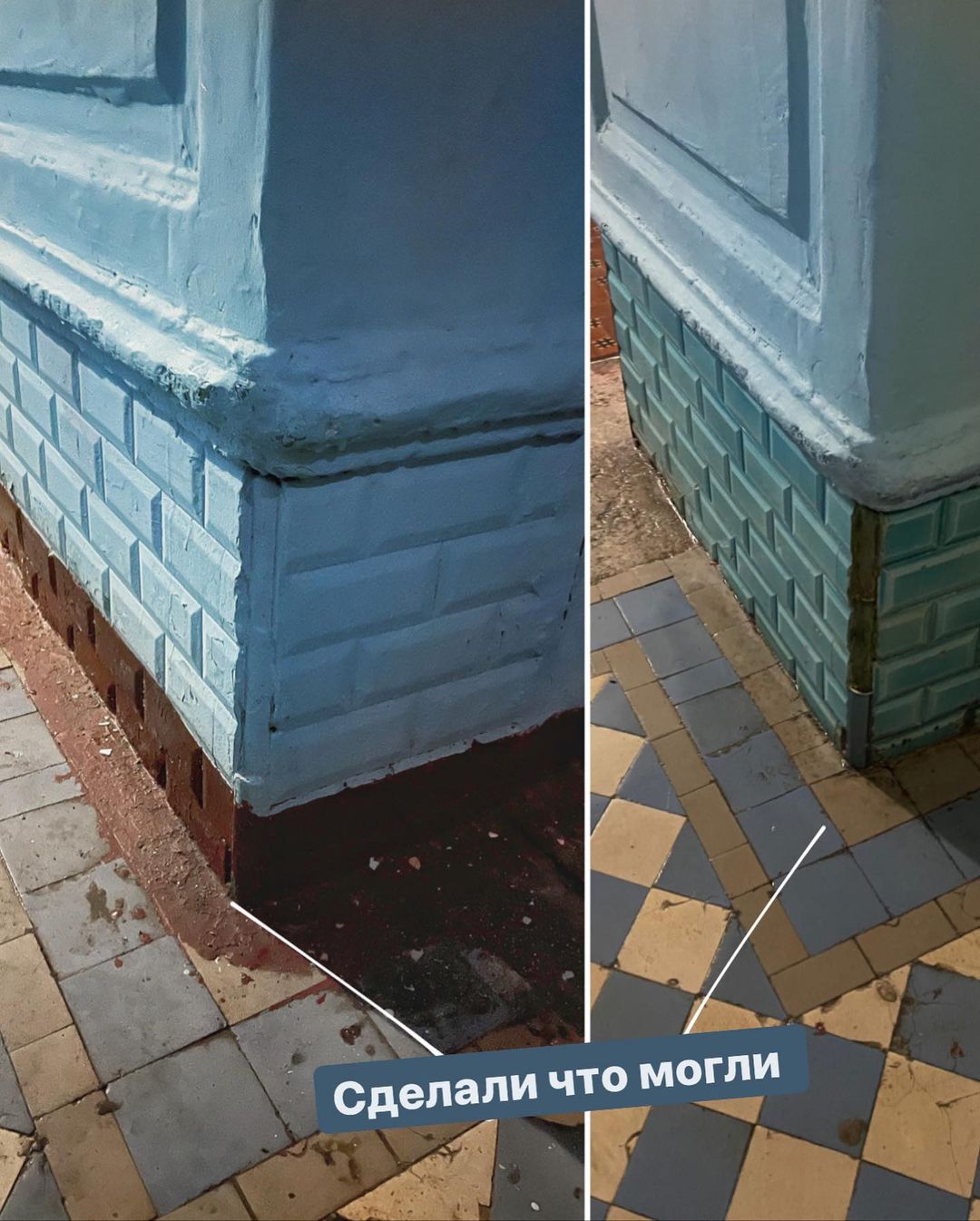Участники краеведческой ячейки «Гэнгъ» отмыли парадную в доме 18-й линии Васильевского острова. Активисты очистили напольную и настенную плитку, а под штукатуркой нашли остатки еще одного плиточного фриза — с лотосами.