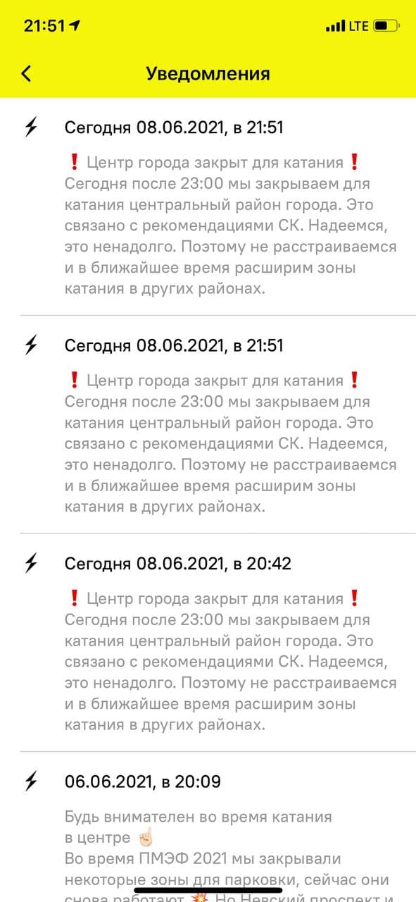 Пользователям приложения Molnia пришло уведомление, что центр города закрыт для катания. В оповещении говорится, что это связано с рекомендациями СК. «Сегодня после 23:00 мы закрываем для катания Центральный район города. <…> Надеемся, это ненадолго», — пишут в Molnia.
