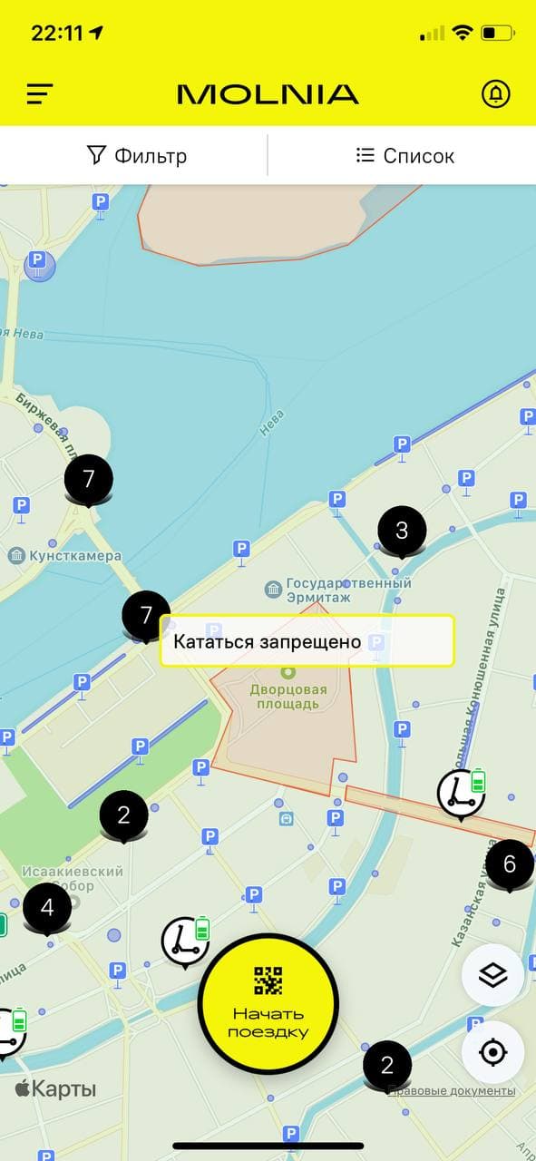 В приложениях сервисов аренды электросамокатов в Петербурге вечером 8 июня появились уведомления о запрете езды в центре Петербурга. На это обратили внимание читатели «Бумаги».