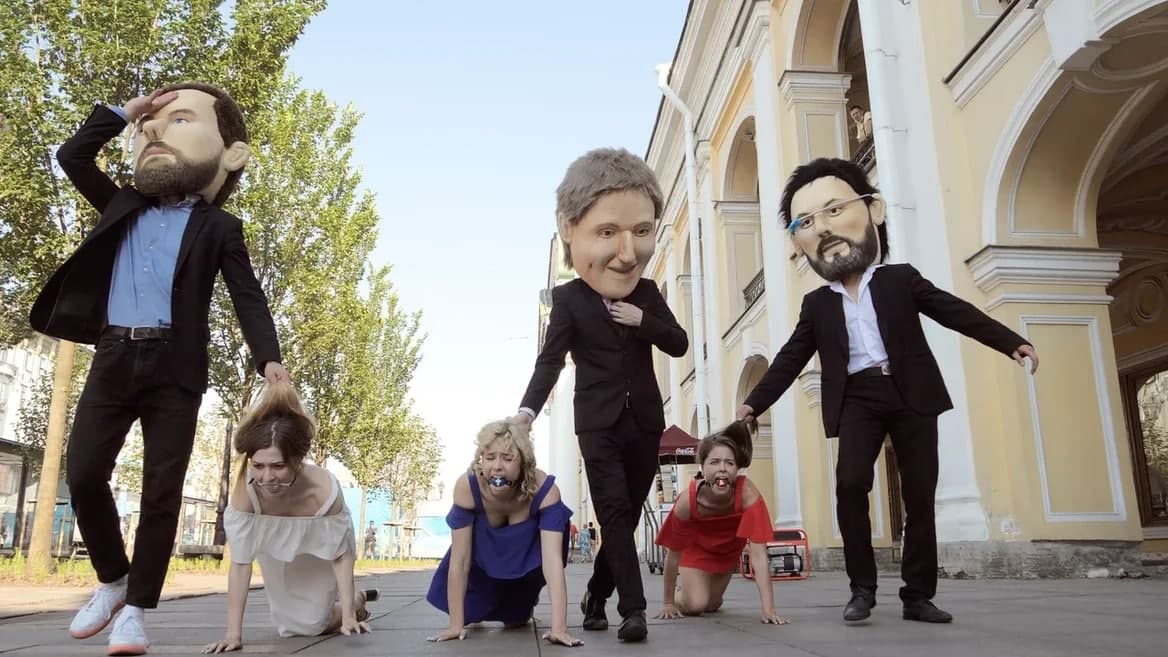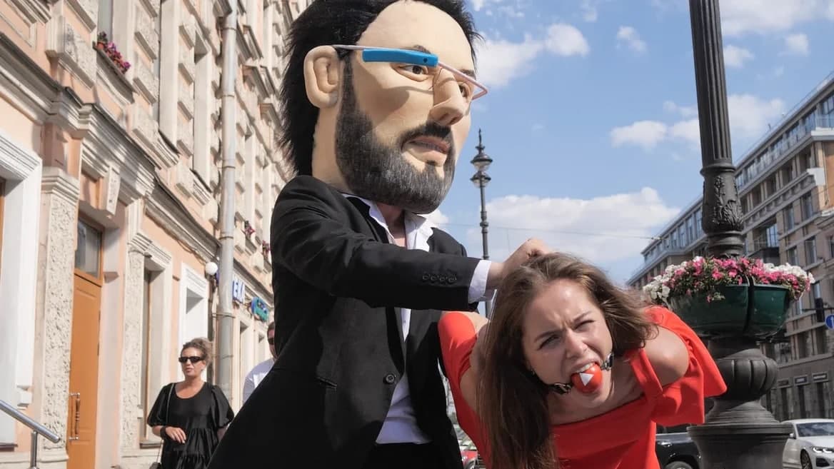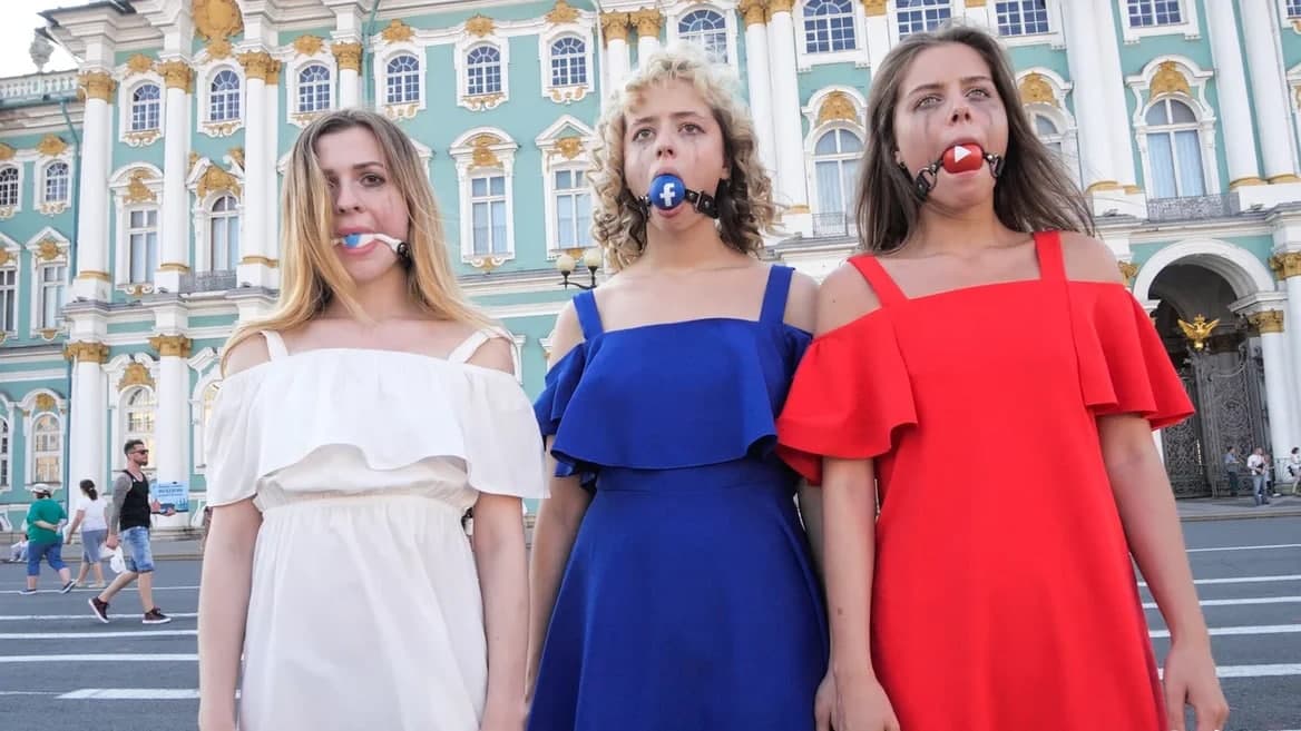 Как сообщили «Бумаге» организаторы акции против цензуры, на улицах Петербурга огромные фигуры Марка Цукерберга (Facebook), Джека Дорси (Twitter) и Сергея Брина (YouTube) «затыкали кляпами рты девушкам, которые символизировали аудиторию социальных сетей». «Насилие над свободой слова происходит публично, безо всякого стеснения, на глазах у всех», — приводятся в поступившем в редакцию письме слова Марии Рейн.