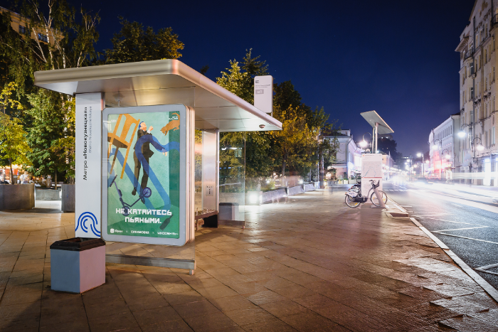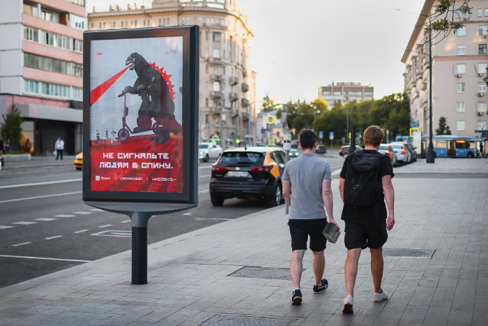 На плакатах написано восемь правил этичного поведения для пользователей электросамокатов: например, «спешивайтесь на переходе», «не катайтесь вдвоем», «паркуйтесь по-человечески» и «не сигнальте людям в спину». Постеры отсылают к знаменитой фотографии группы The Beatles на Эбби-Роуд, фотографии «Поцелуй на Таймс-сквер» Альберта Эйзенштадта, персонажу комиксов и фильмов Годзилле, а также высадке к на Луну и творчеству Сальвадора Дали.