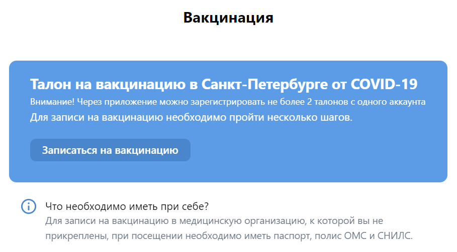 В сервисе можно посмотреть информацию о свободных талонах в каждом районе города, для записи нужно выбрать пункт вакцинации и время, а также ввести личные данные.