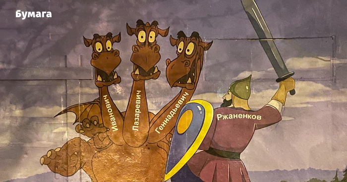 В Петербурге появился стрит-арт со Змеем Горынычем. Три головы — три Вишневских, а богатырь — единоросс, в пользу которого предлагали вбросить бюллетени