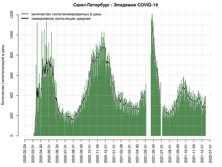 Госпитализация 2383 человек за неделю — чуть меньше среднего значения для Петербурга. Для сравнения: с 14 по 20 декабря в петербургские больницы отправили 2644 человека, с 15 по 21 ноября — 2514, с 1 по 7 октября — 2765.