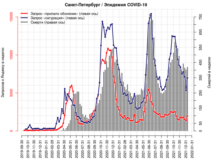 Помимо этого, в Петербурге растет количество проводимых тестов в день, а также число запросов в «Яндексе» с ключевыми словами «пропало обоняние» и «сатурация», следует из графиков Куприянова.