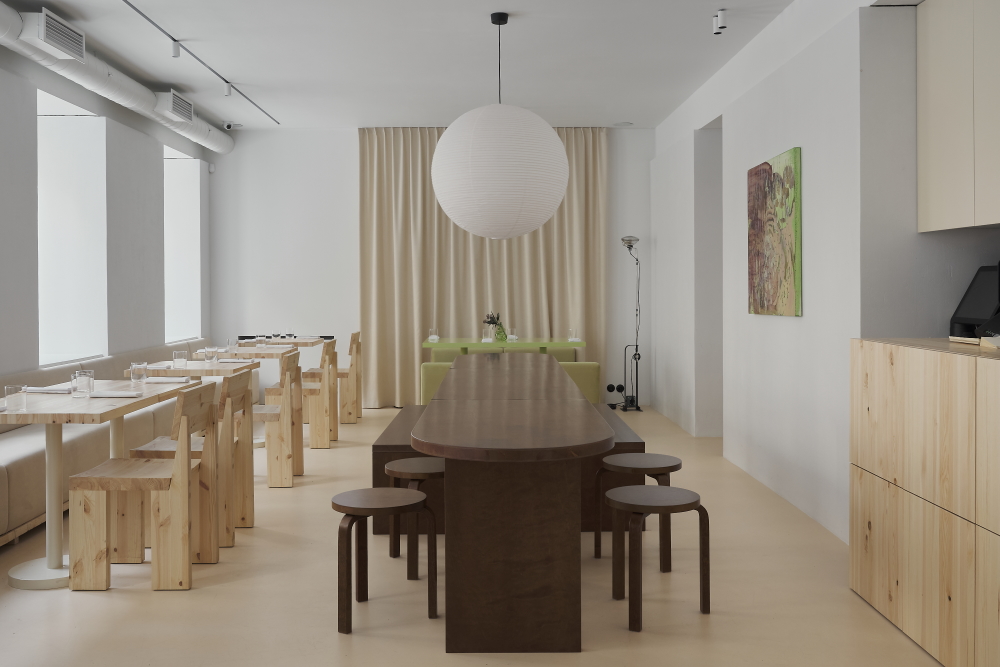 Заведение занимает один зал на 30 посадочных мест, его оформлением занималось дизайн-бюро AKME. Интерьер сделали светлым и минималистичным, дизайнеры использовали зеленые цветовые акценты и деревянные стулья от финского бренда Vaarnii. Кроме того, в ресторане можно увидеть картину художника Владислава Кулькова.