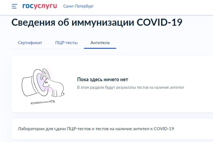 Для оформления сертификата принимаются положительные результаты с любым уровнем антител (иммуноглобулин G), если тесты были сделаны в аккредитованных лабораториях. Чтобы получить QR-код, нужно подать заявление на «Госуслугах». Так, в разделе «Сведения об иммунизации COVID-19» появился подраздел «Антитела», где можно сообщить об отсутствии данных о результате теста.