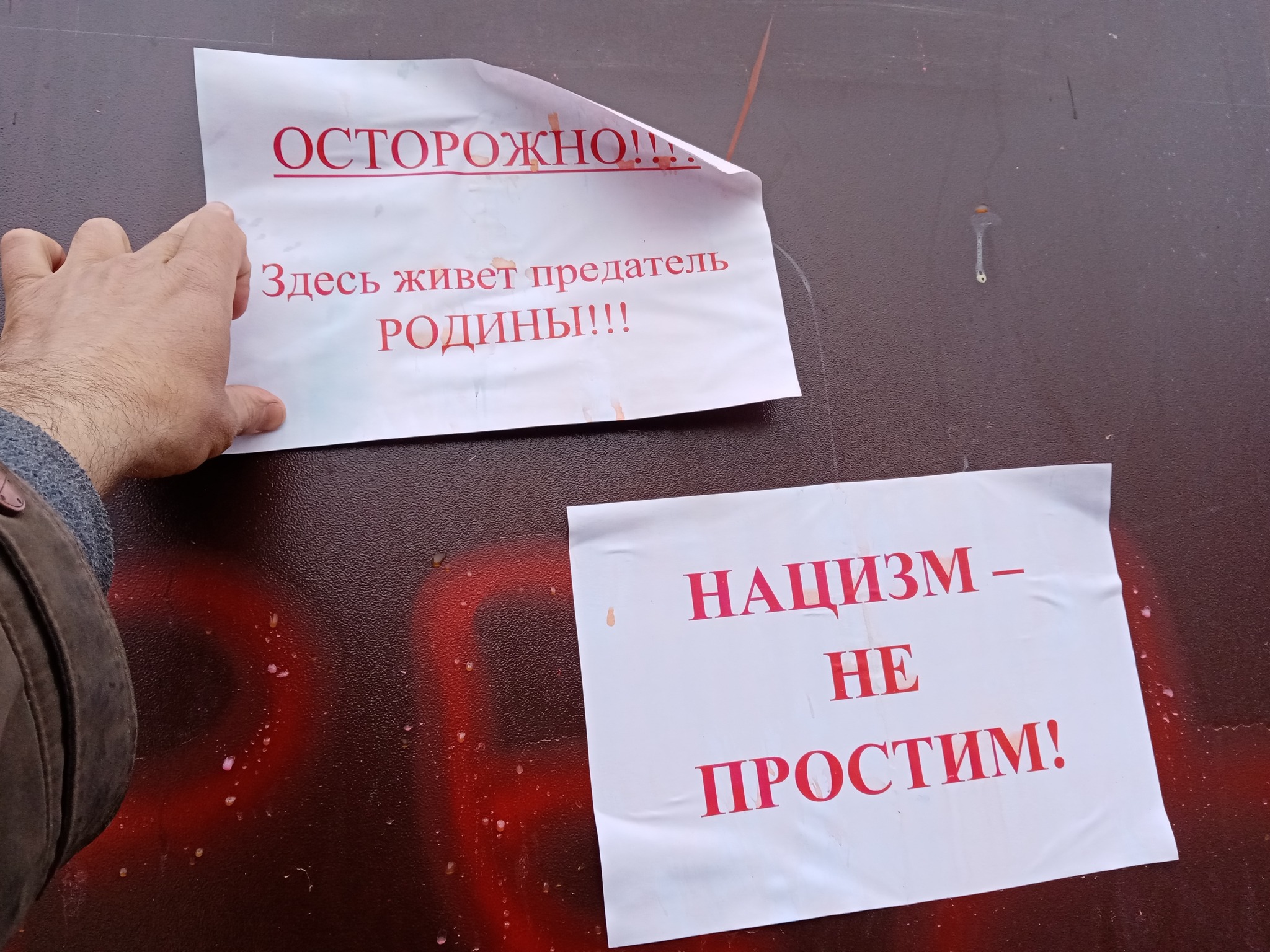 Неизвестные оставили под дверью магазина кучу навоза, минимум четырежды написали на фасаде слово «предатель», а также расклеили записки с текстом «ОСТОРОЖНО!!!! Здесь живет предатель Родины!!!» и «Нацизм — не простим!». Вандалы также оставили обращение к местным жителям и администрации магазина, в котором назвали Скурихина нацистом, призвали администрацию магазина отказаться от арендуемой площади и оставили угрозу Скурихину: «Предатель, жди мы рядом! Все предатели родины будут наказаны!» (сохранена авторская орфография).